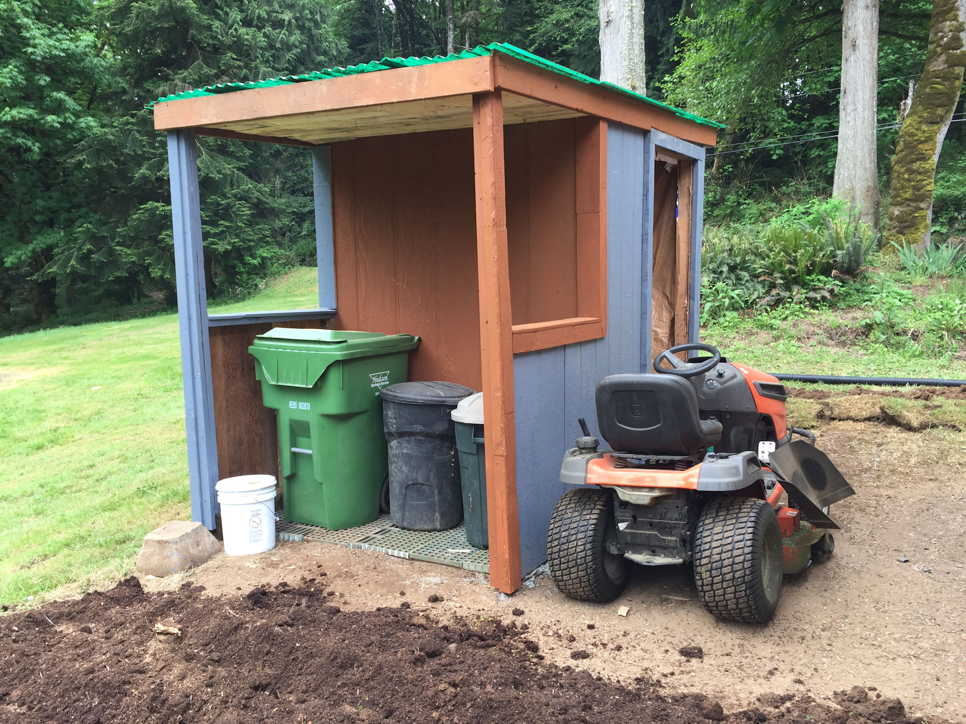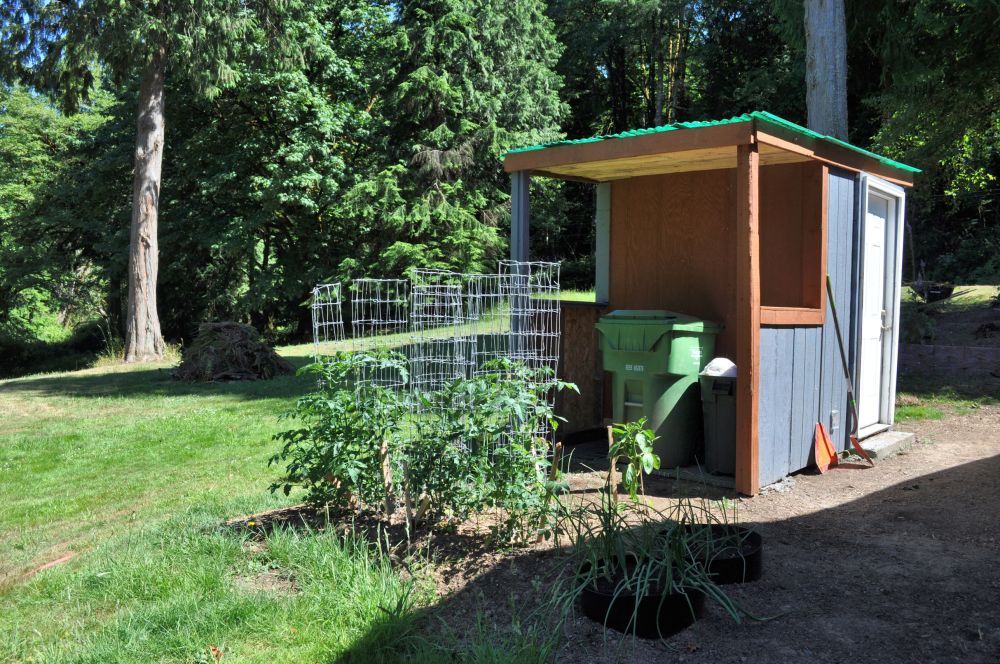 Then he built a pumphouse entirely out of recycled materials. I asked for a roof over the back for a place to store my trash and recycling bins. Since he was in there anyway, he put a spigot on the outside of the pumphouse, which is wonderful because I didn’t have water on this side of the house and had to buy a 100 foot hose to drag over here. Then he installed an outside outlet and some flood lights. This guy can do anything, I’m telling you.