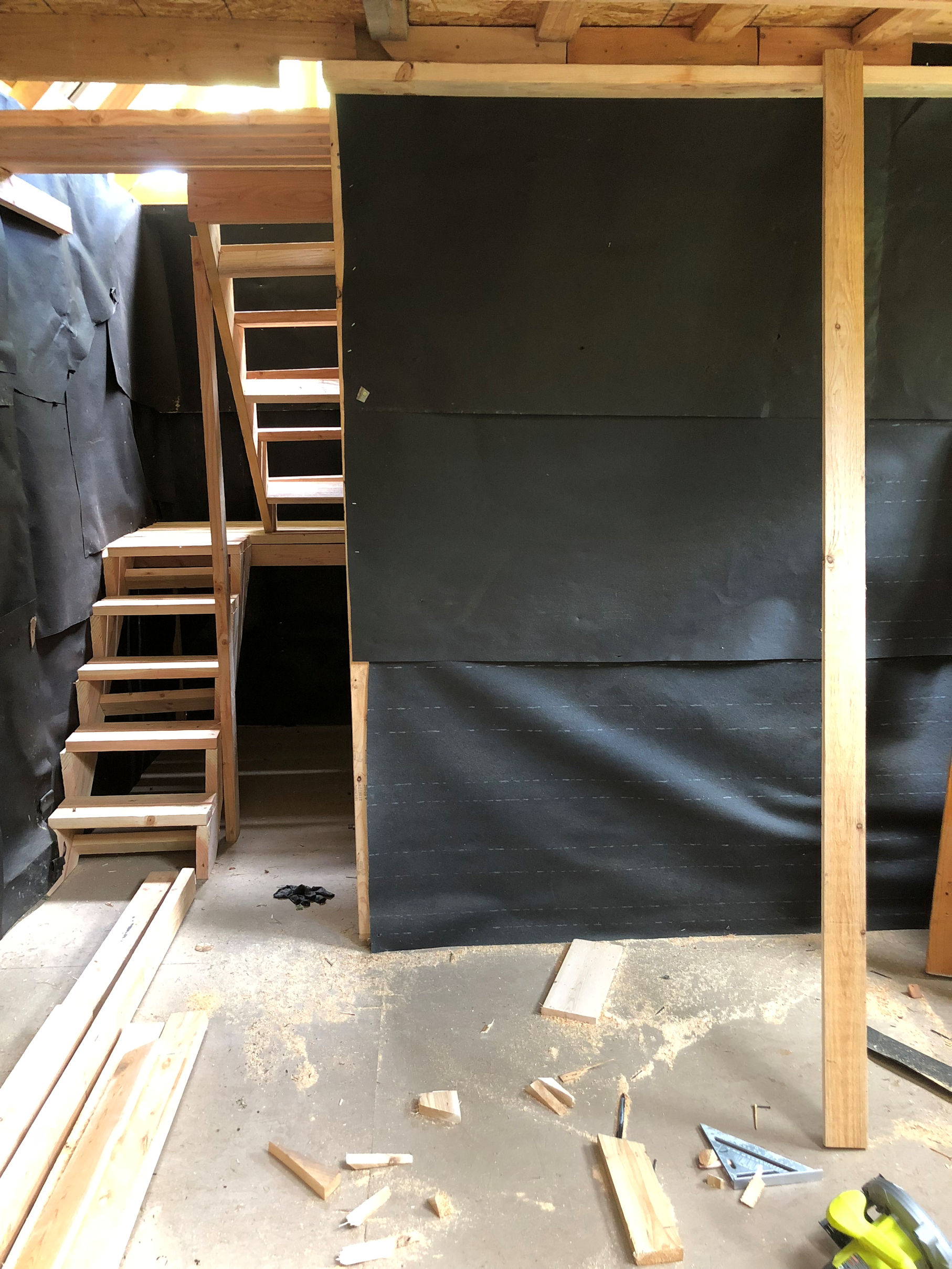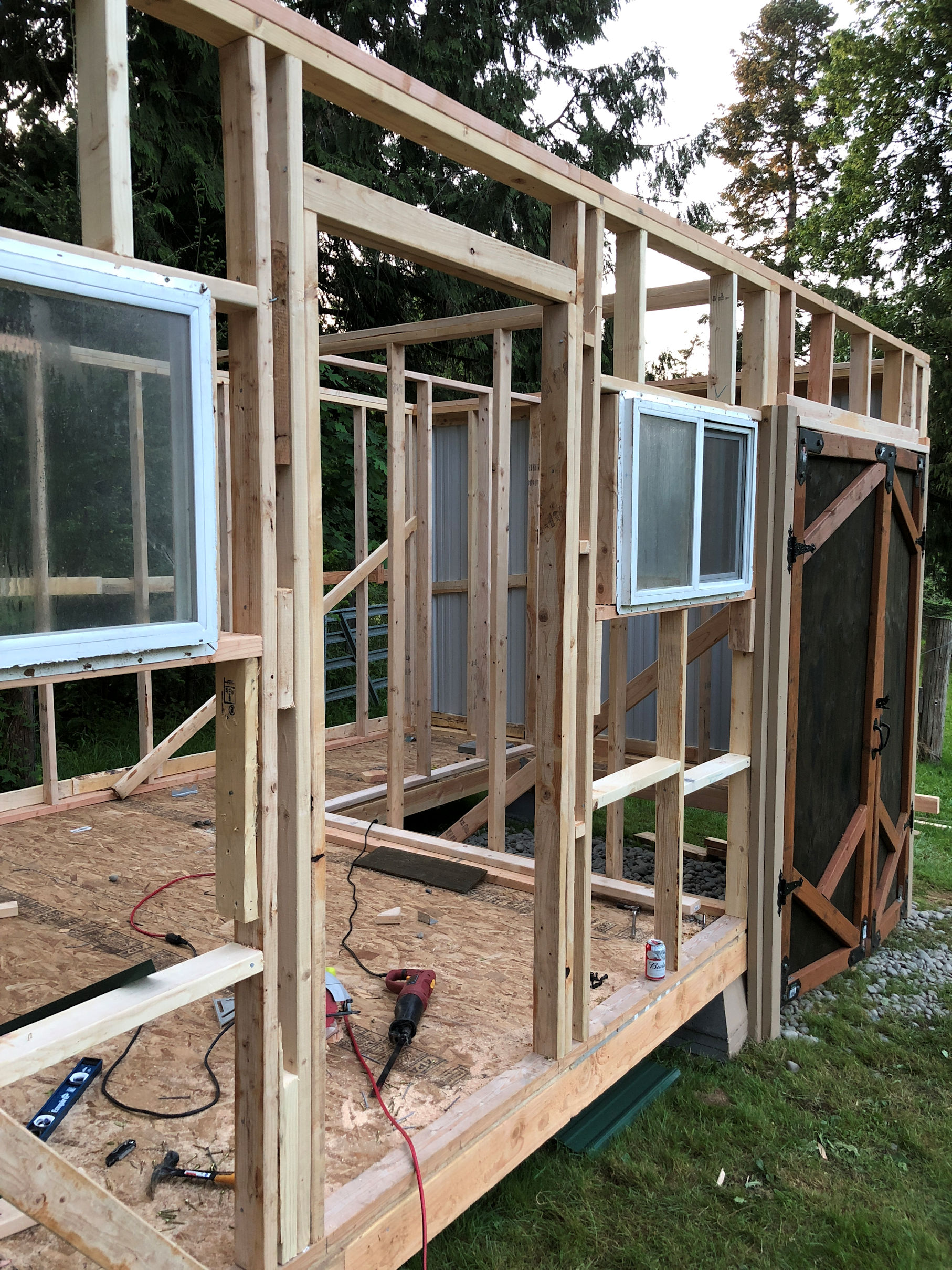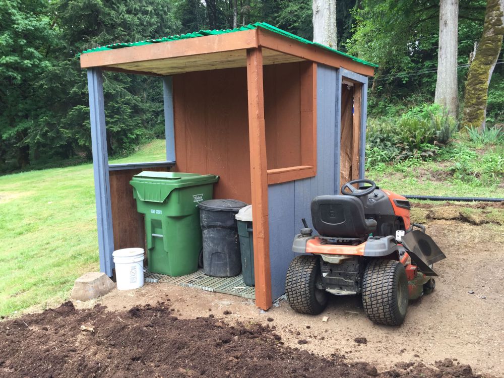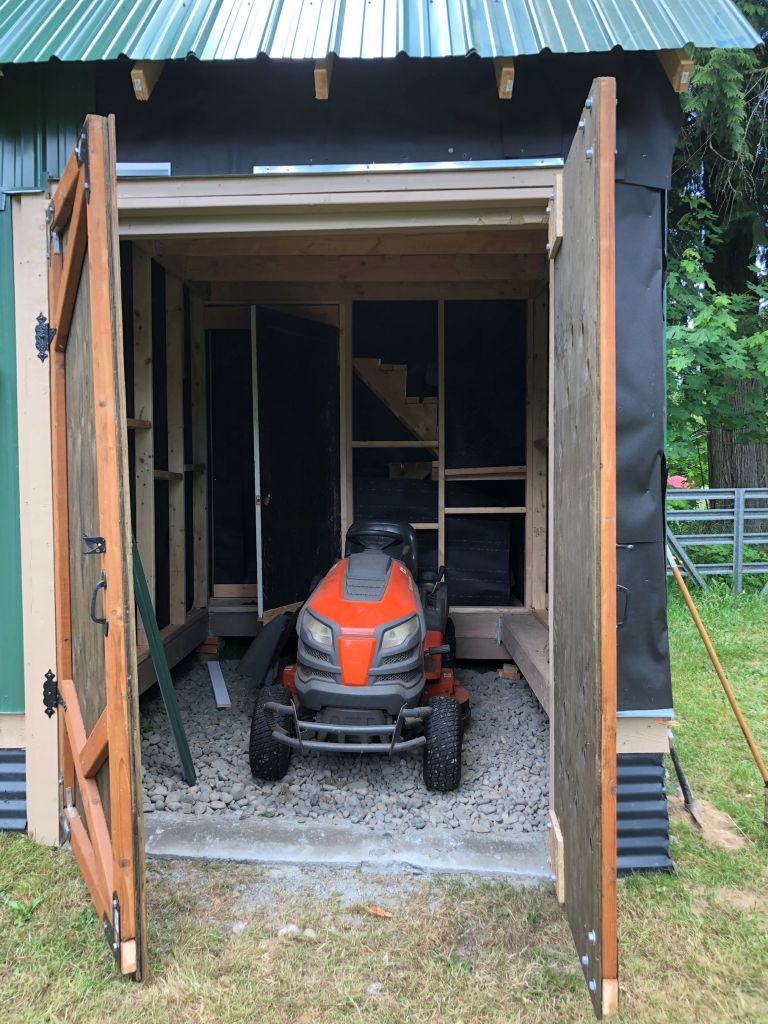 Now I needed a space to store all my equipment that had previously been stored in the shed. I pointed out the place where I wanted it built. Josh thinks about it for a couple hours, jots a materials list down on a piece of paper. I handed him my credit card and off he went to Home Depot. In no time, the place was going up.