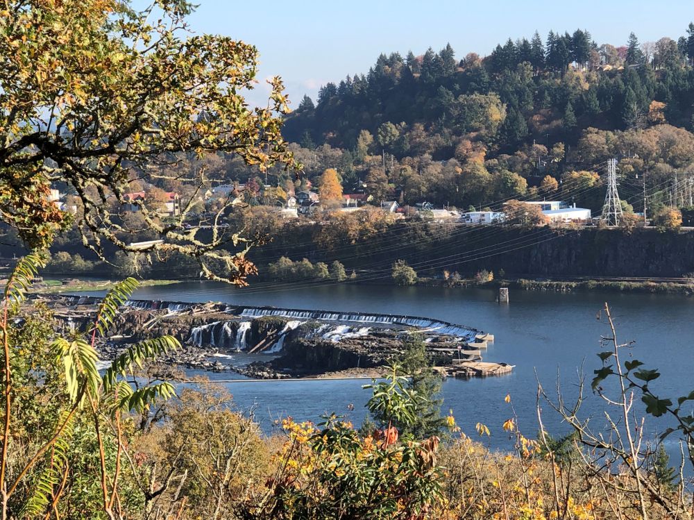After leaving there, I stopped alongside the highway for an overlook point I had never previously investigated. Trees and bushes make the view difficult and I stood on top of a rock wall to see better Willamette Falls, a curved basalt falls in the Willamette River, that is 42 feet high and 1500 feet wide.