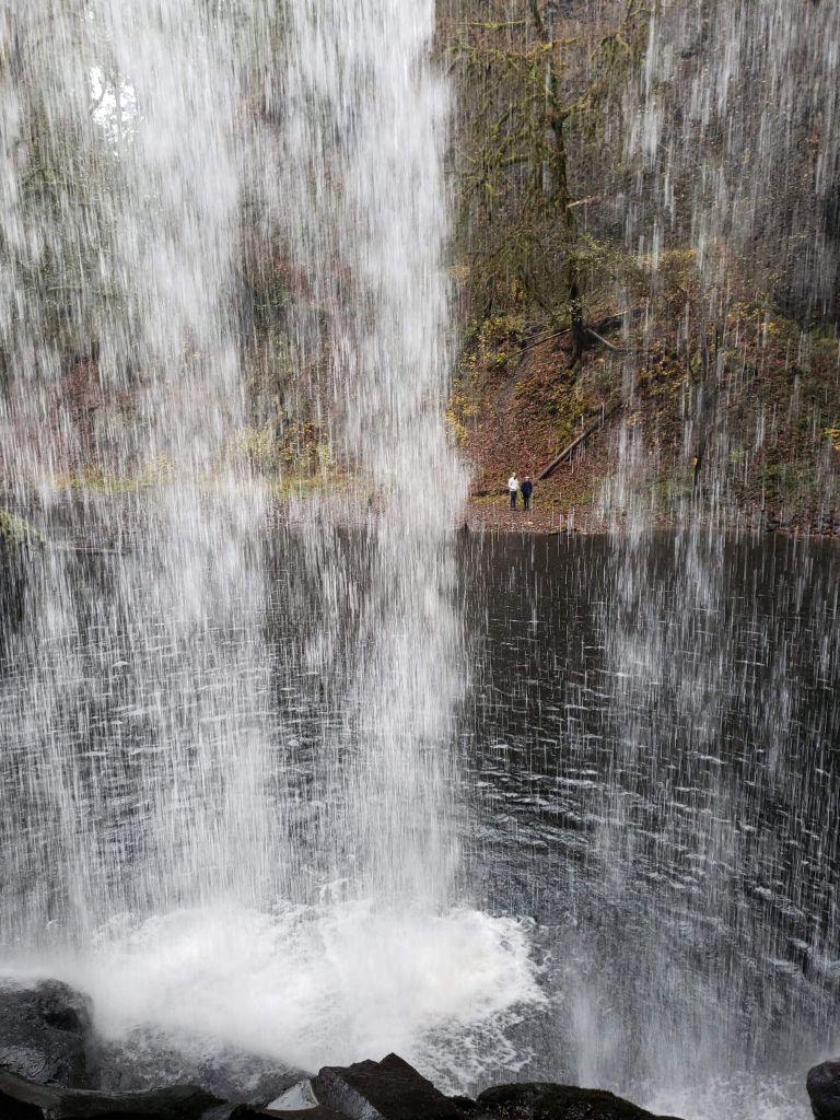 He would spot a place that seemed better, and would carefully climb over there. Then he would spot a new place, and make his way slowly. Before we knew it, he had made a whole circle of the canyon, including walking behind the waterfall!
