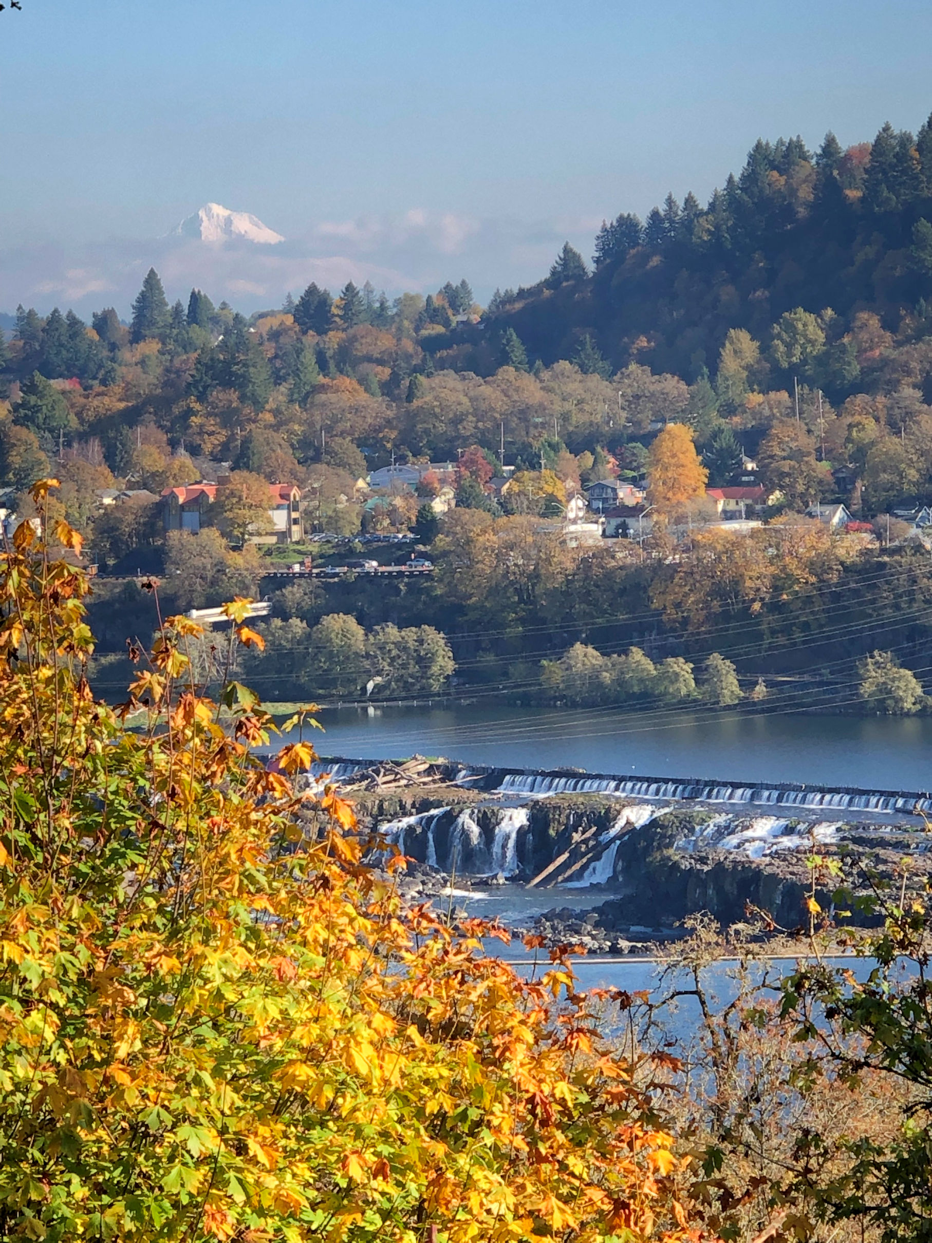 After leaving there, I stopped alongside the highway for an overlook point I had never previously investigated. Trees and bushes make the view difficult and I stood on top of a rock wall to see better Willamette Falls, a curved basalt falls in the Willamette River, that is 42 feet high and 1500 feet wide.