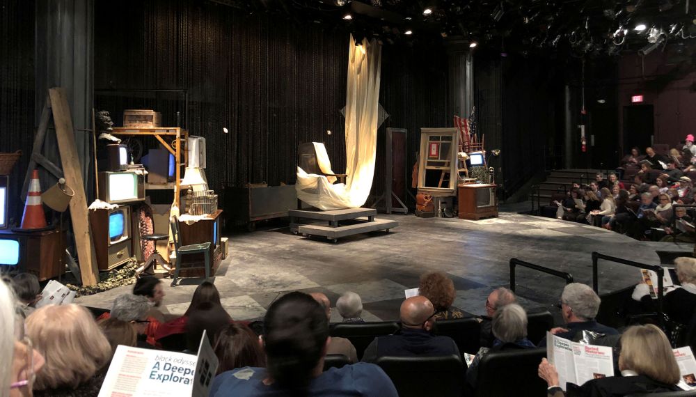 On the far right and left of the stage sit piles of old television sets that at first didn’t make much sense to me as a prop, and then became integral. The sets are different sizes, one tipped onto its side, and each displays a different scene, so the message isn’t always obvious. When Ulysses is drowning, for example, the scenes were all of rough ocean waters – that was pretty obvious. But at other times during the show, there are scenes from Oakland city, news broadcasts of historical events, or other evocative imagery including contemporary events like flooding during Hurricane Katrina and recognizable police camera footage, that help the audience put pieces together.