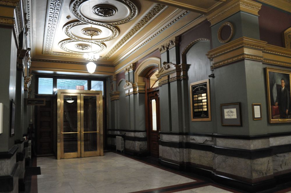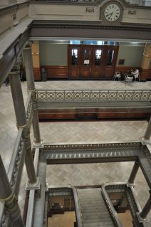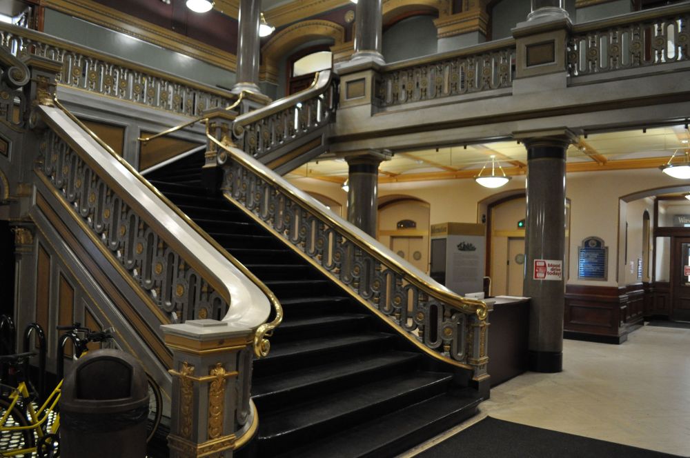 Right next door is the Providence City Hall, a beautiful building on the outside, and simply gorgeous on the inside. It was built in the 1870s, and continues in use today as the City Hall. The five-story building is built of iron and brick, and at the time of construction employed some fascinating technology. There was a water-powered elevator that could carry 50 people, but is no longer in operation. Prior to electricity, a central control clock was used, wound up each morning by the janitor like a grandfather clock. The clock sent a signal to all the other clocks in the building. The City Messenger’s office was equipped with bells and speaking tubes that connected to all the other offices in the building. Remnants of these features are still visible today.