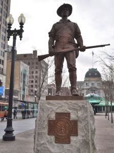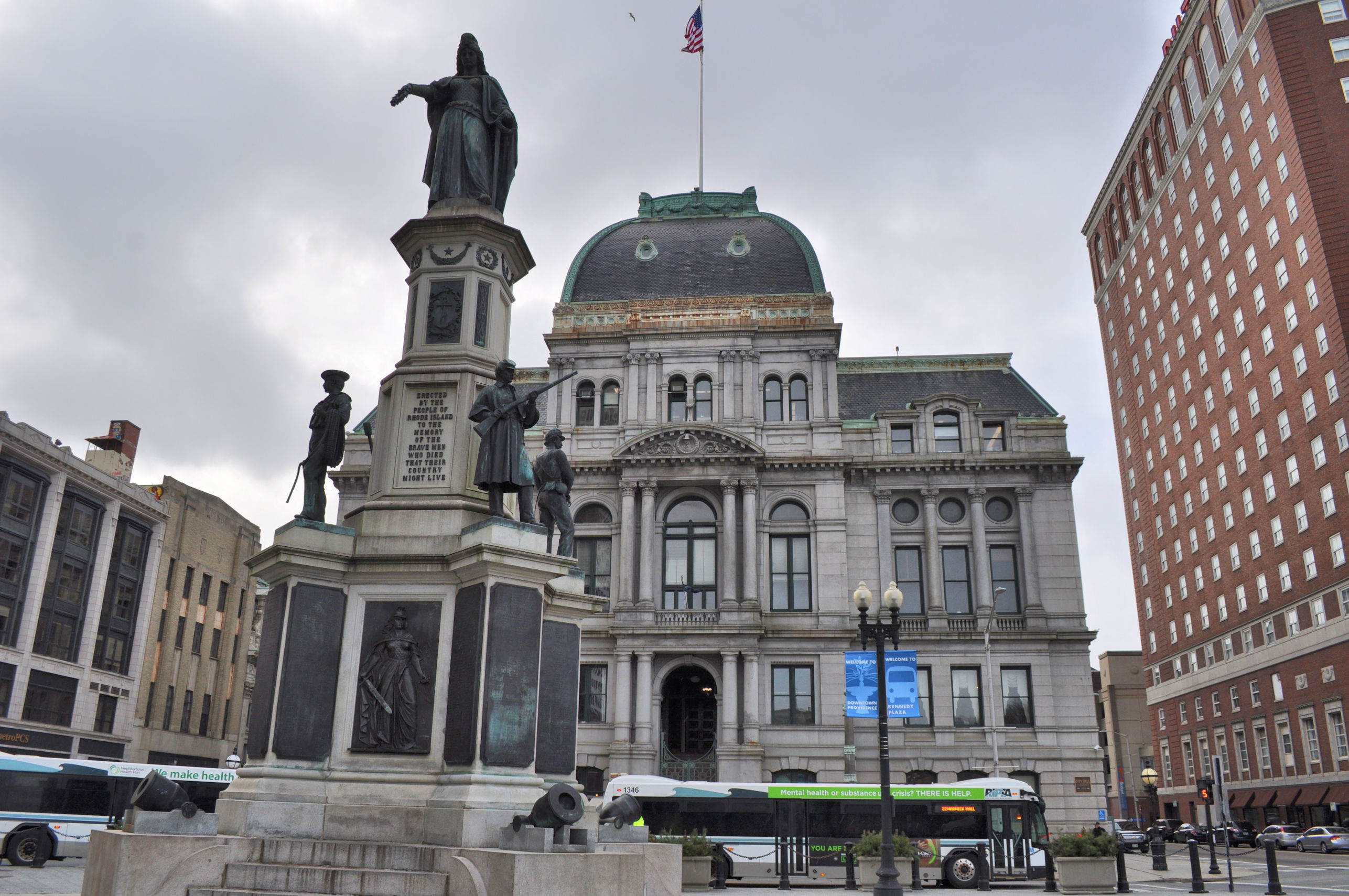 We crossed the street to gaze at a few monuments. The first was the Soldiers and Sailors Monument, shown in the image at the top of this post. Dedicated in 1871, the 40-foot monument recognizes 1,727 Rhode Islanders that died during the Civil War. The figure at the top represents America, and the four smaller figures represent four branches of the military. The bronze reliefs are allegorical representations of War, Victory, Peace, and Freedom.
