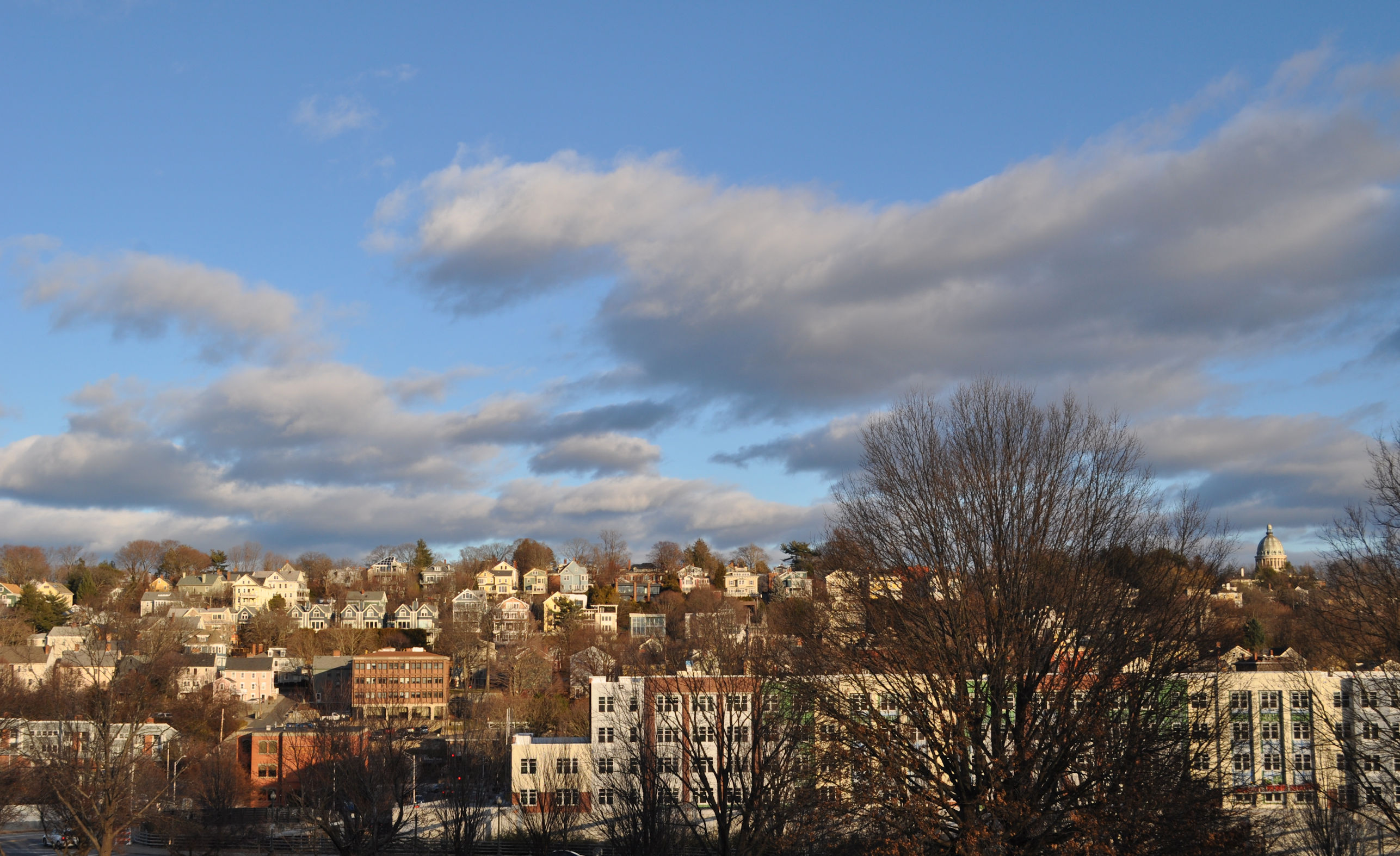 We stopped for lunch and I had Indian curry & Jasmine tea because isn’t that just the thing on a fiercely cold day? (This time I mean Asian Indian, not North American Indian. So confusing. Chris Columbus you goofball.) Then we walked uphill some more and I was excited when it began to snow! We came to a park very high up that Will calls “The other Roger Williams Park,” but it’s actually called Prospect Terrace Park. I didn’t get photos of it but there is a curious larger than life statue of Roger Williams looking out over the city. So we looked out over the city too: