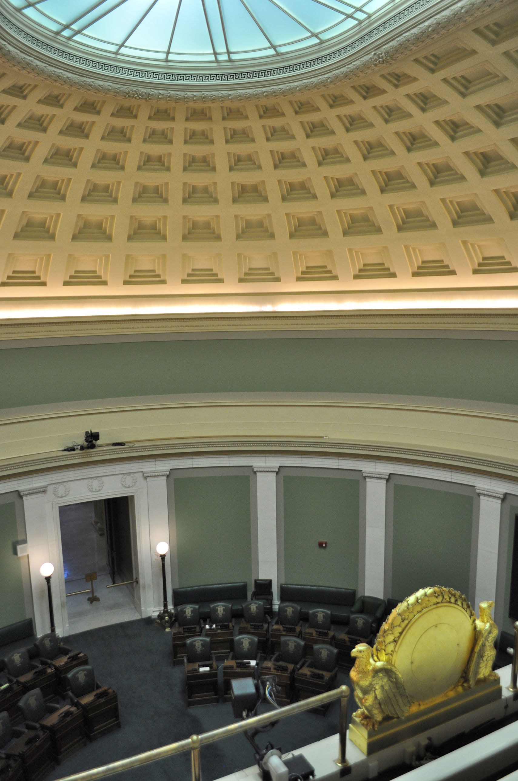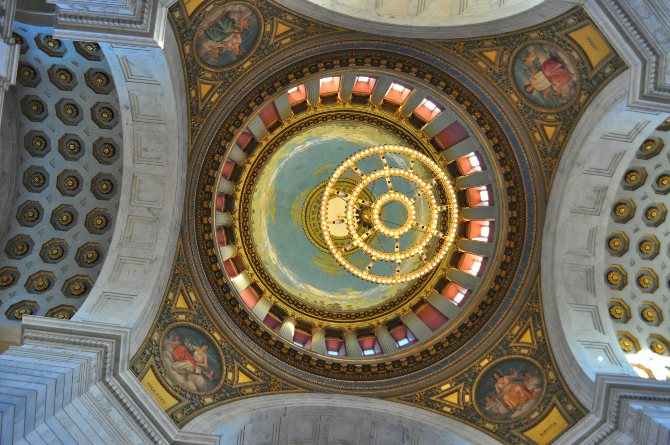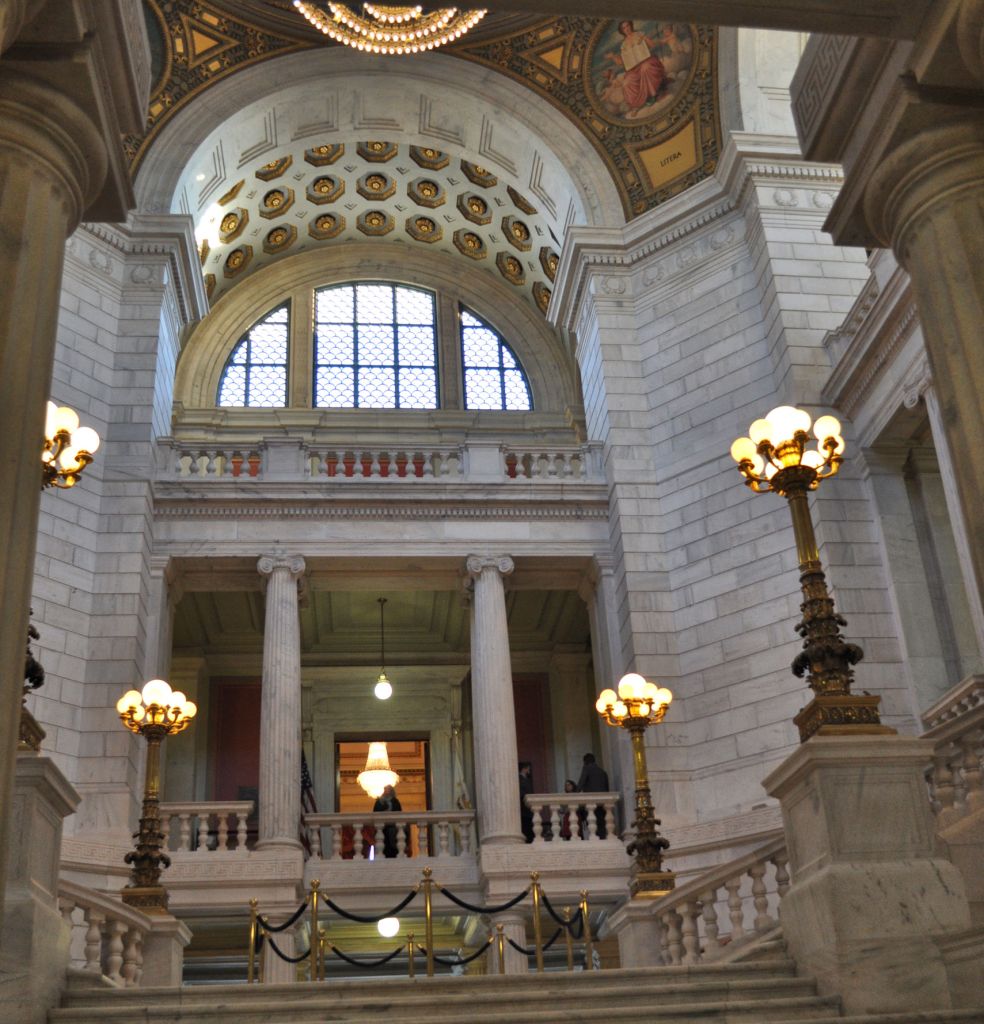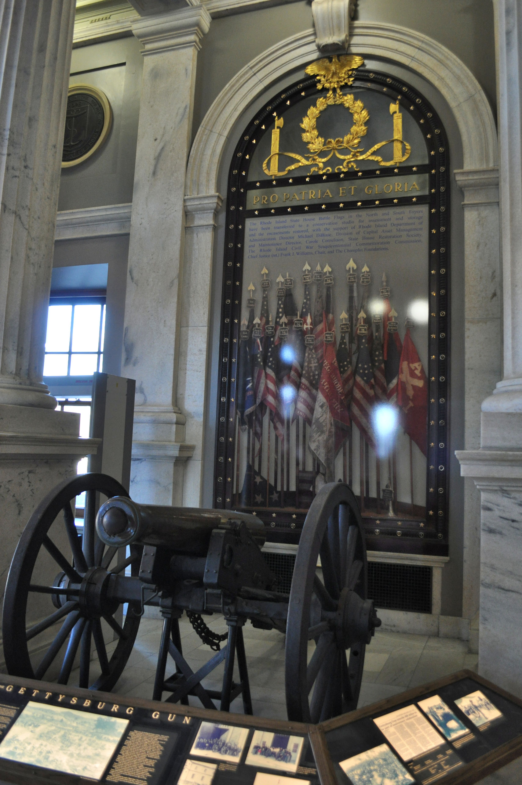 To get into the State House we had to have ID checked and pass through a metal detector. Once inside, I was doubly impressed by the grandeur here than I had been by City Hall. The foyer holds a Civil War gun that was last fired on the final day of the Battle of Gettysburg in 1863. The gun was struck by a Confederate shell, damaging the muzzle of the gun and killing two soldiers. An attempt was made to reload the gun. Try as they might, members of the Rhode Island Light Artillery could not force the charge into the gun. When another shell hit and blew a wheel off, they gave up. The gun was allowed to cool, sealing the charge in place.