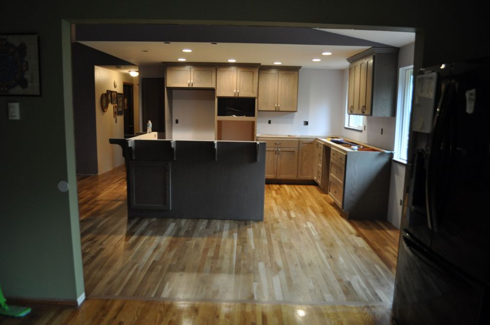 I scraped the popcorn off the ceiling so I could have a nice smooth finish. Then I began emptying the cupboards and the pantry.Then tore out all the old cupboards, removed the appliances, and began tearing up the tile floor. The refrigerator was moved into the TV room and plugged in with an extension cord running into my bedroom, behind me as I take the photo.At that point the contract work came in, dismantling the walls. Look how much that opens up the room already!After everything was torn out, I cleaned up the floor. It’s still such a mess.Sheetrock went up, the water heater was replaced with a tankless water heater for more space, and I was able to begin to visualize the future finished walls.Tara came home from college for a couple days and we painted the walls.Where did I wash dishes for all that time? You guessed it: in my bathroom sink. No, it was not ideal.When the painting was done, the electrician hooked up some of the lights so we had something to work by. Then the cabinets were installed.At long, long last the floor was installed. It was finally taking shape. Since the wood in the kitchen is white oak, and the wood in the TV room is red oak, it’s not a seamless transition. As the wood ages it will blend better. Even with the different wood, I like this much better than the trim pieces in between each room. Now it’s a flat surface that doesn’t trap dirt.Finally put the dining table and the refrigerator back into the kitchen (and I scratched my beautiful floor in doing so – arrrgh!). Also installed microwave and wall oven.And viola! My kitchen today. I’m all moved in and cooking again. And washing dishes in a proper sink.