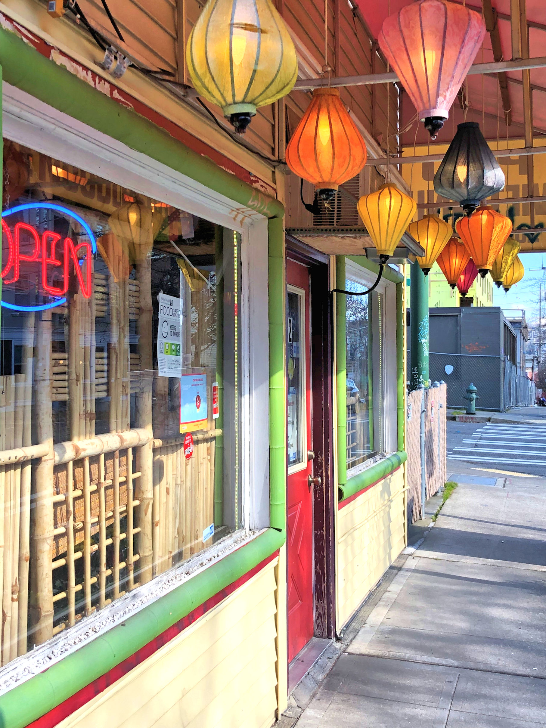 We rode the monorail to the Pike Place Market and then returned early to meet Ian and Karen and go have dinner and drinks at a bar atop the Graduate Hotel, called The Mountaineering Club. A friend of theirs is the kitchen manager and gave them the heads up that it’s now open. On such a spectacular day, it was a perfect place for even more amazing views without buying a ticket or waiting 45 minutes. We chose the outdoor seating at first, and were provided with blankets to stay warm out there while we watched the sunset. Then we moved inside to eat our meal at themed tables holding old mountaineering equipment. I had the most delicious drink of my life called “We Put Nettles In This,” with Bolivian Brandy, Aloe Vera, Grapefruit Cordial, Suze, Lime, Celery Bitters, and Nettle Fizz.