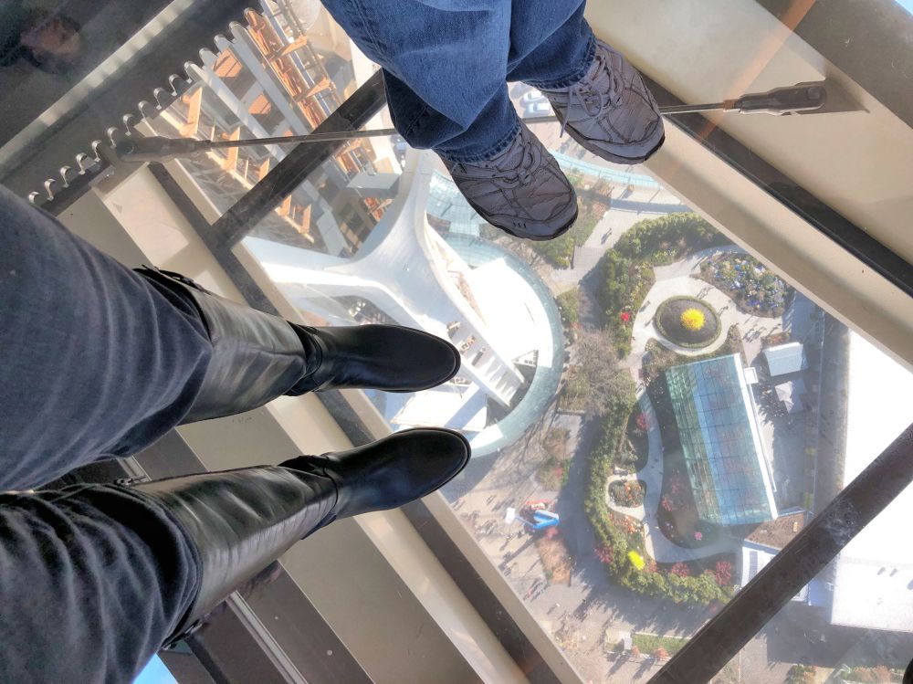 We looped the upper observation deck and got photos in every direction, even scrutinizing the nearby neighborhoods till we picked out Ian and Karen’s house! We went downstairs to the rotating restaurant, and there we found the glass floors. That is when my stomach really began doing flip flops.