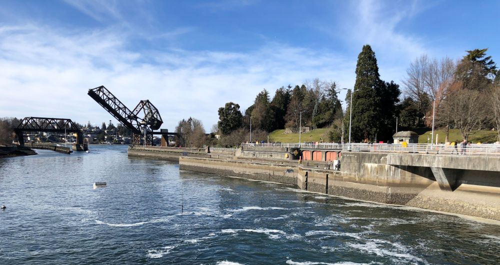The next day Ian took us to the Ballard Locks, which dates from 1917. While we waited for the boats to fill the lock between Puget Sound and Lake Union (and Lake Washington, on the other side of Lake Union), we spotted wildlife. We saw Seattle’s official city bird, the Great Blue Heron. Their most serious predator in the area is Bald Eagles, and the eagles do not like all the noise of the locks, the train, and the people, so they stay away and allow the herons to raise their young.