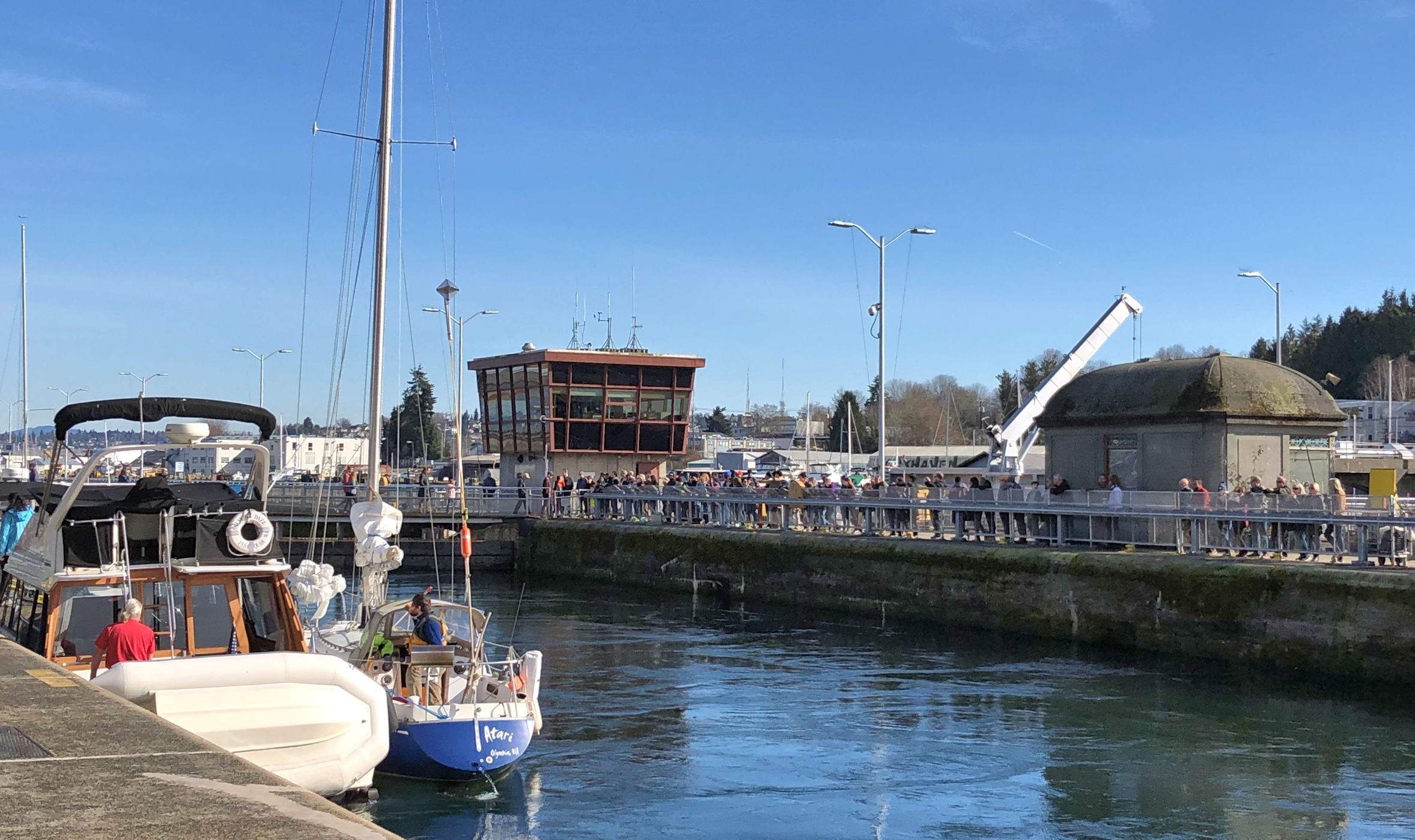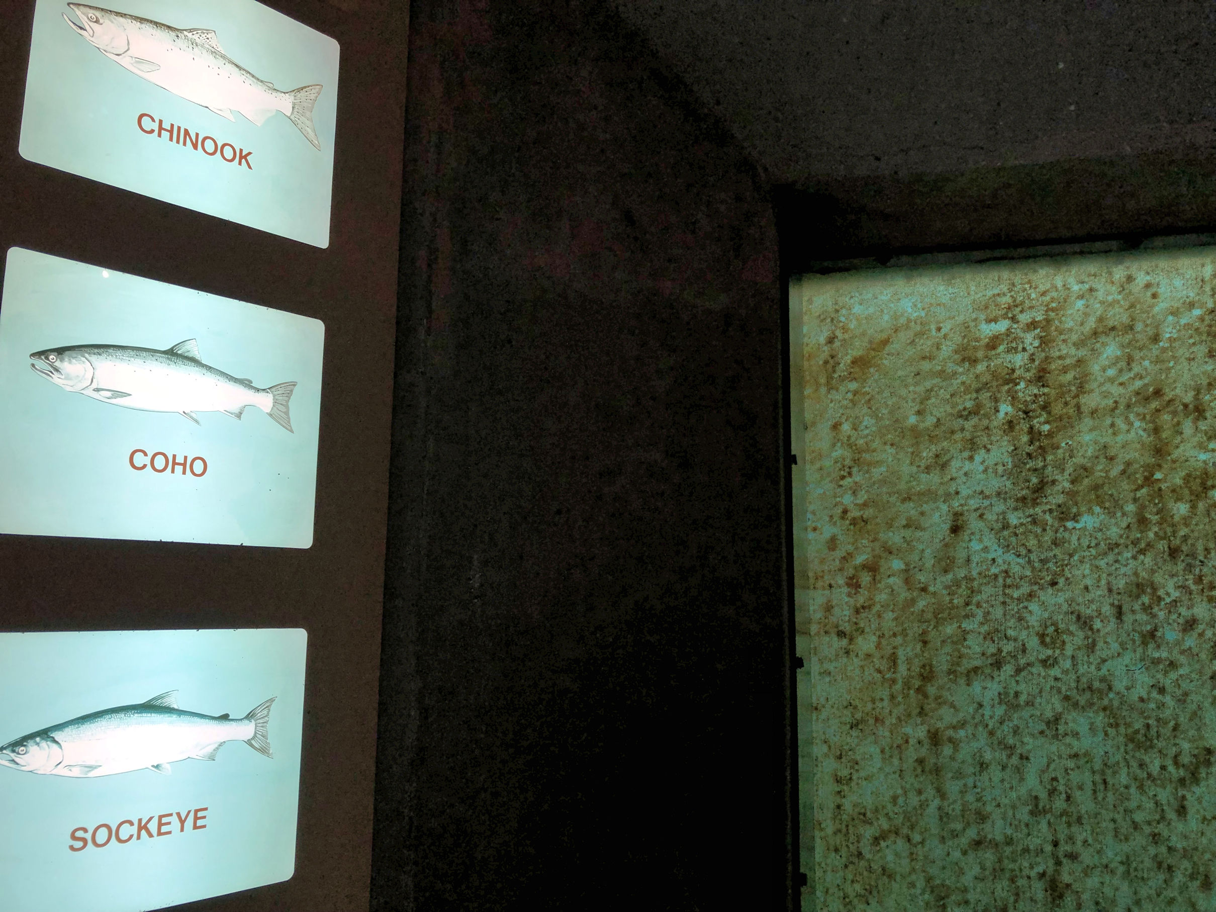 We got tired of waiting and walked over to the fish ladders. This is an important route for salmon migrations, so the locks are designed to make it easy for fish to climb or descend the 26 feet between the fresh water lakes and salt water sound. There is a educational center that has been closed for a long time and not yet made ready for the public, so we were able to get up close to the glass viewing windows, but as you can see from the photo, we did not see any migrating salmon.