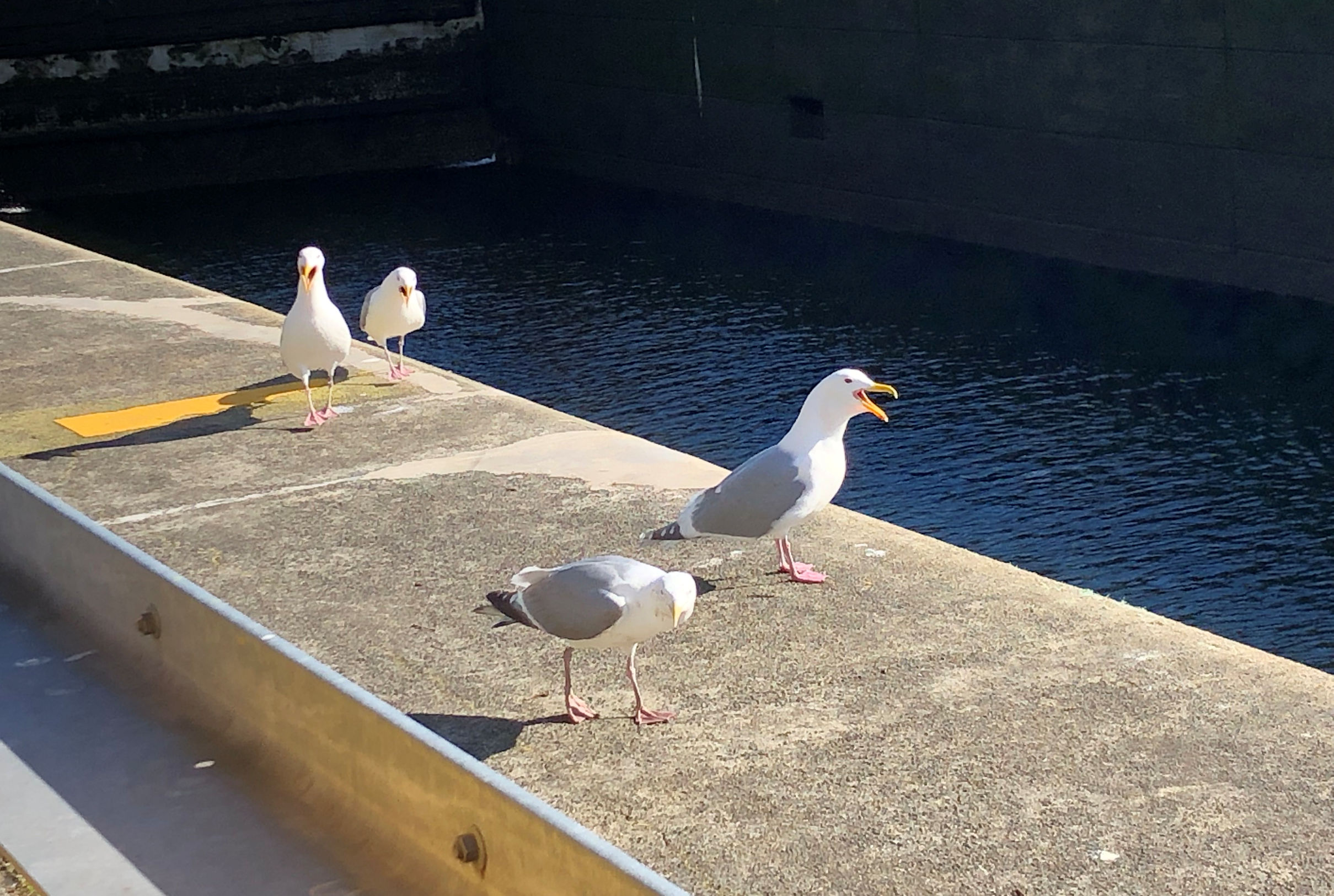 While we were viewing the fish ladder, the lock sent a load of boats out and we missed it! This time we stayed put until a group of small boats collected inside the lock and then we watched the water fill it up. When the gate opened and the boats were free to go, we left too.