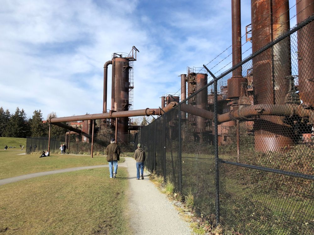 Next Ian took us to Gas Works Park. It is the site of a coal gasification plant that operated in the first half of the 20th century. Contaminated soil and groundwater were cleaned up when the former Seattle Gas Light Company site was made into a park. I absolutely love the look of the abandoned natural gas generator towers, and the other structures remaining. Much of the pump house and boiler house still contain original pumps, compressors, and piping and are open to children or adults who want to climb around or picnic, but the highest structures are fenced off.
