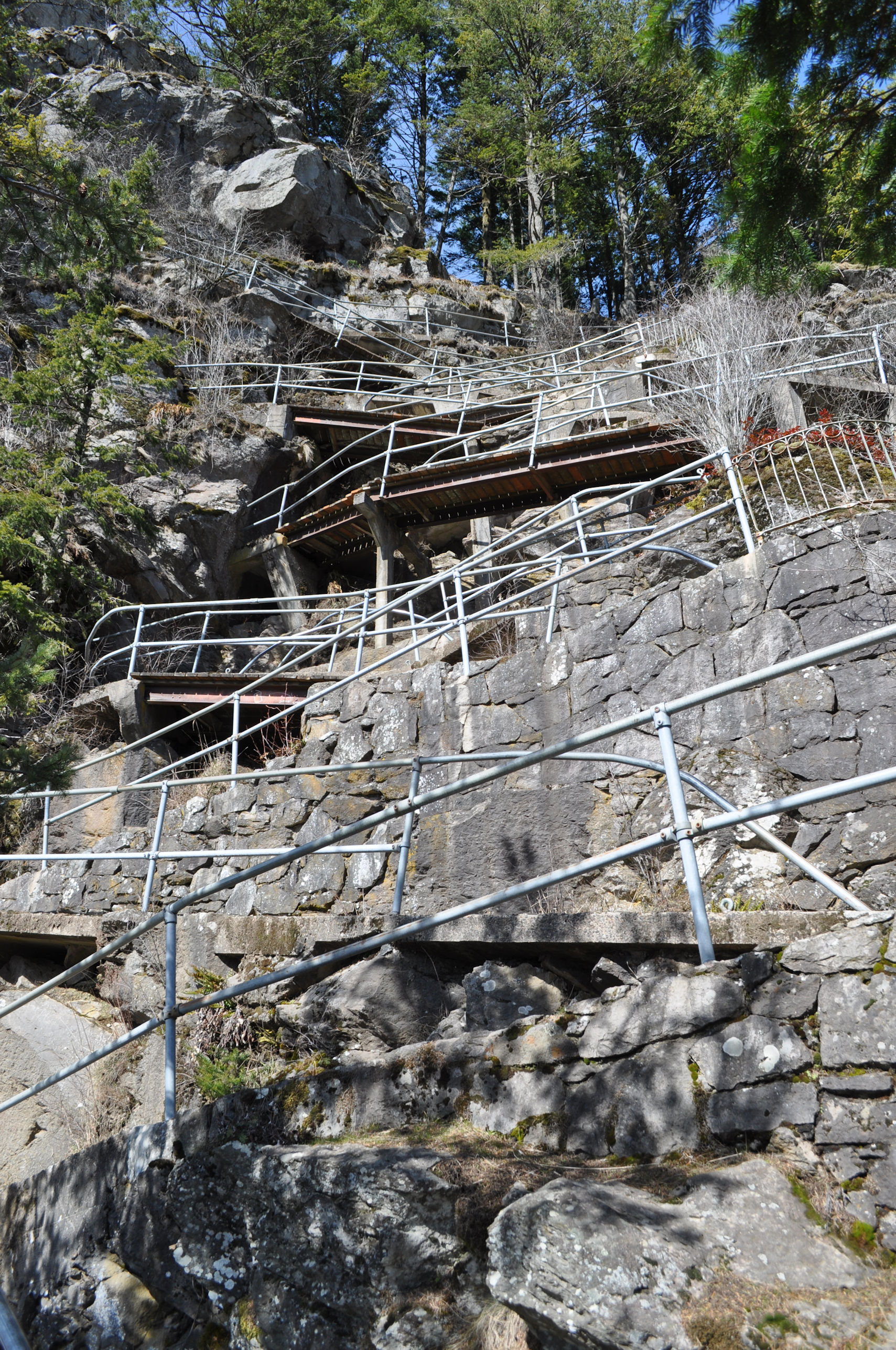 The trail remains today and is one mile long with 53 switchbacks. There is a small viewing place at the top, 848 feet up. There are great views all the way up, so you don’t have to reach the top for a reward. However, if you do press on (and if you skate over the icy patches we found on the shady west side), you have a 360-degree view from the top.