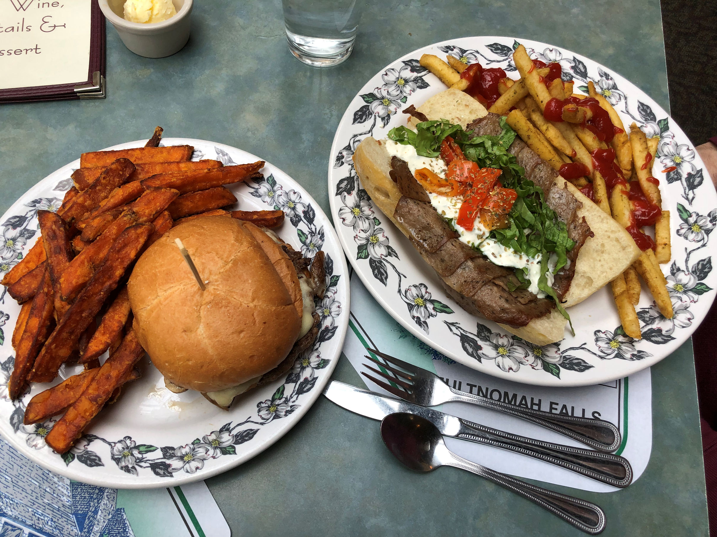 By then we were starving, and it was time to indulge in the fare at the Multnomah Falls Lodge. The lodge is gorgeous outside and inside, featuring walls of glass panes so that we could look at the falls while we ate. The lodge theme is maintained inside the restaurant, with rustic and historic decor, and a massive fireplace. The food is always high quality.