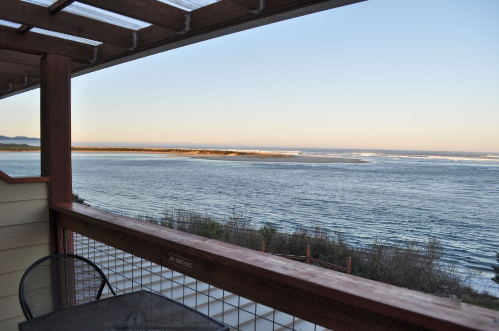 View of Netarts Bay from the patio of our room at Terimore Motel. The Pacific Ocean is on the horizon.