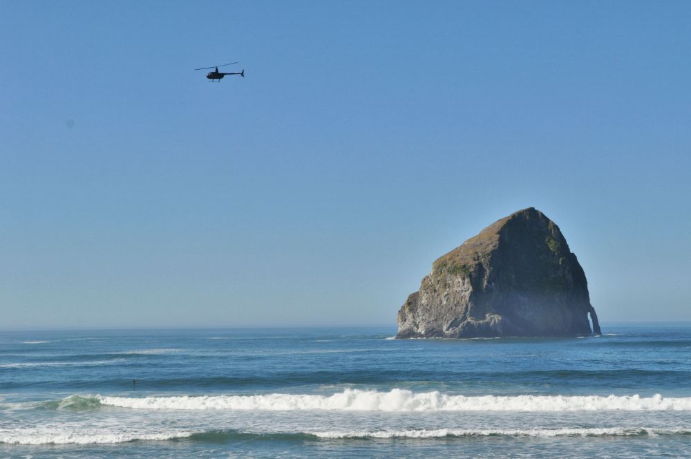 A helicopter flies over Haystack Rock. Well, one of the Haystack Rocks.