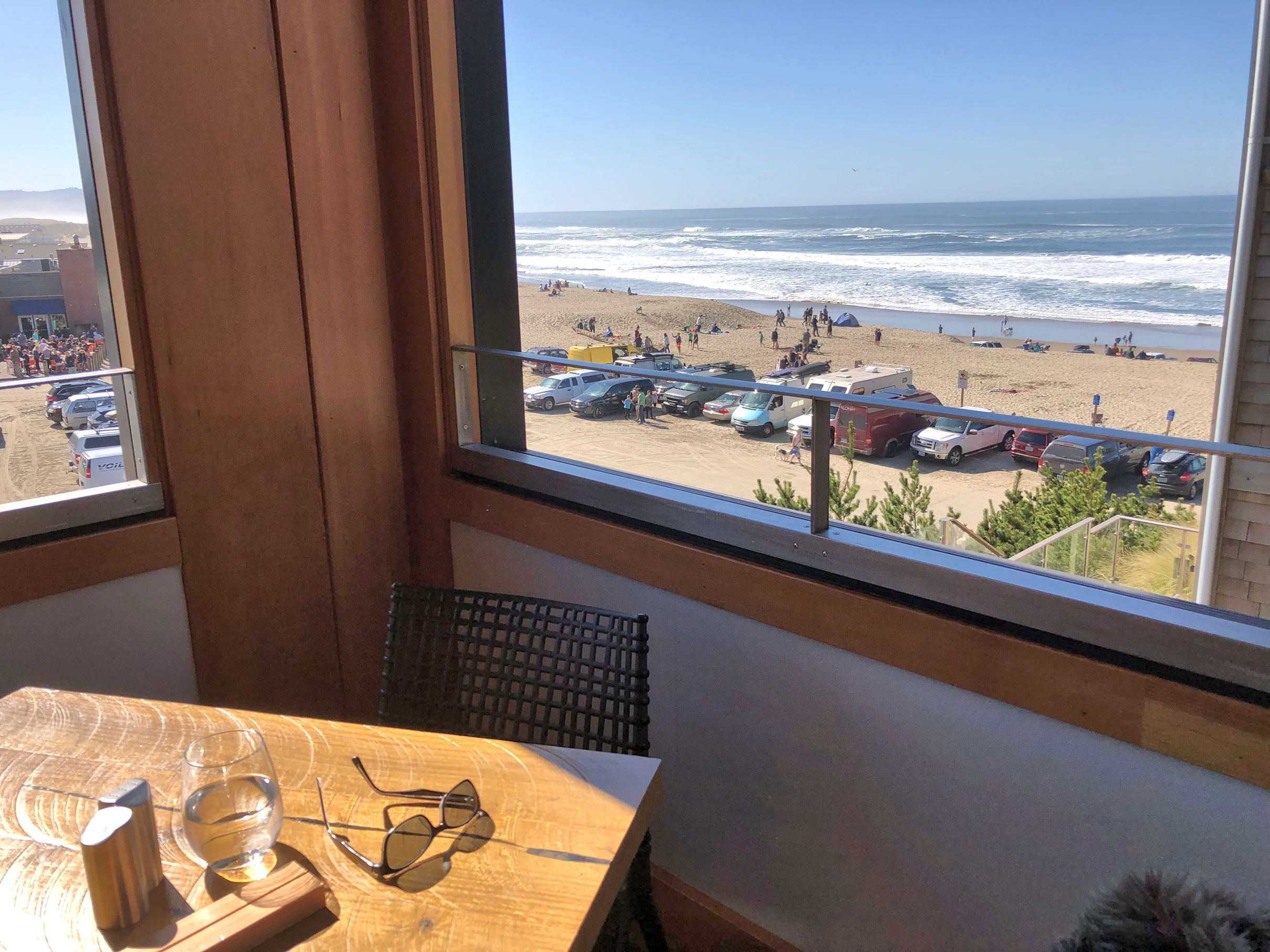 One great choice for a meal and a drink is the Pelican Brewery, because the deck with outside seating rests directly on the sand and the views are extraordinary. But it was crawling with people. We ate instead at Headlands Lodge. The Meridian restaurant has large open windows overlooking the beach. While we waited for our food, the air & sunshine coming in the window was warm and we contentedly watched surfers and parkers viciously vying for a parking space on the sandy lot. The parkers turned out to be the more interesting group.