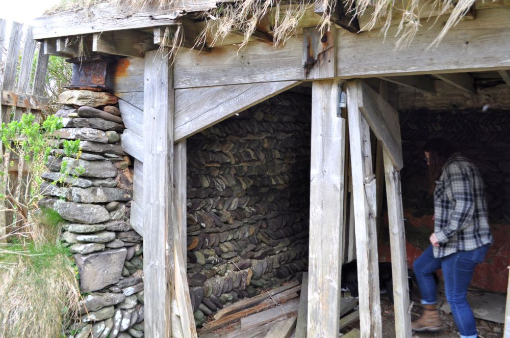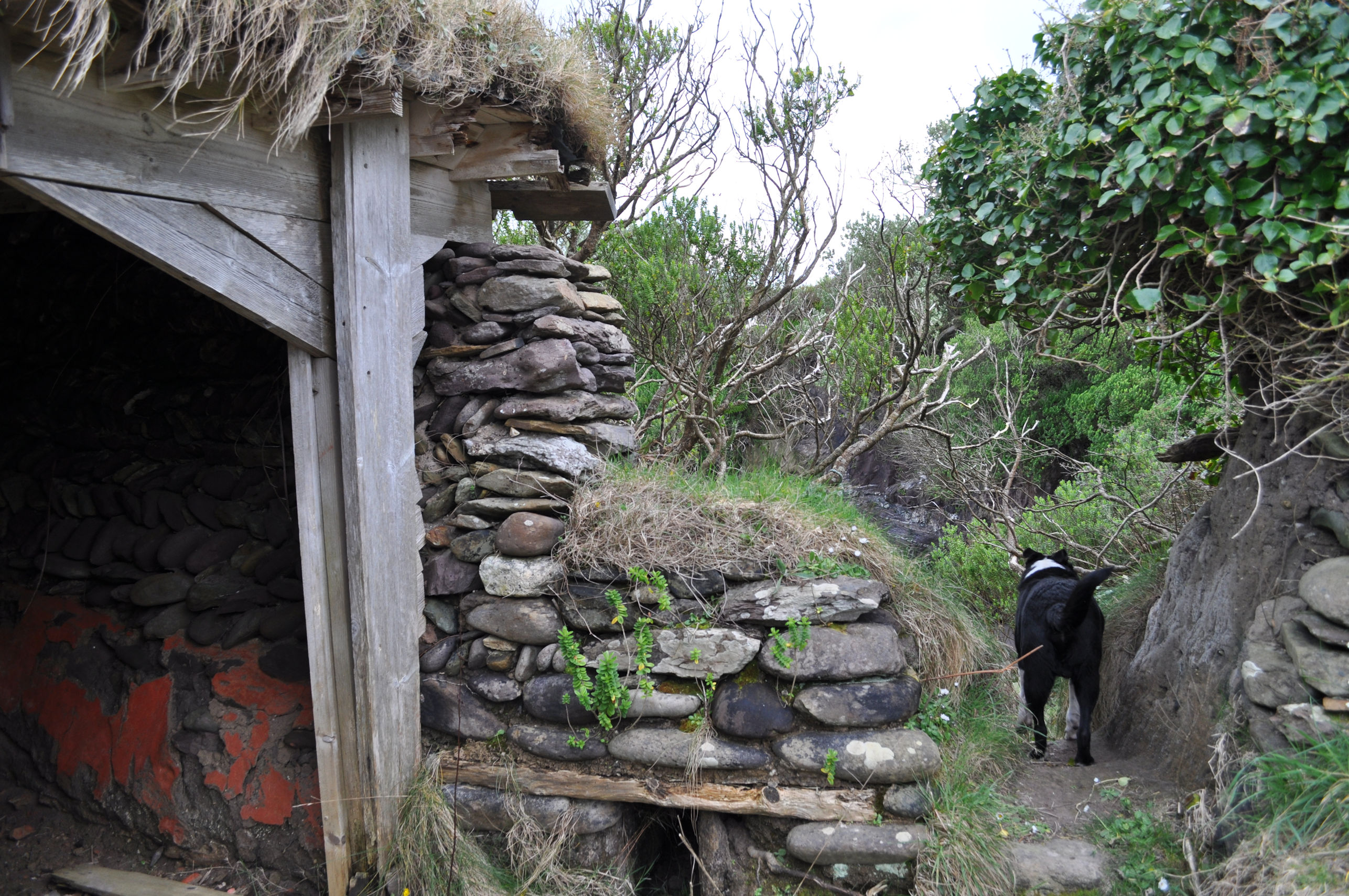 The retreating tides allowed us more beach access, and soon the dogs were bounding up a trail on the opposite side of the beach. So we followed them up another crag of rocks. At the top we found a dilapidated stone and wood hut that delighted us. But then, we found a door ajar at the back of the hut, and pressed through it. Obviously. Before long we were at another fabulous vista point.
