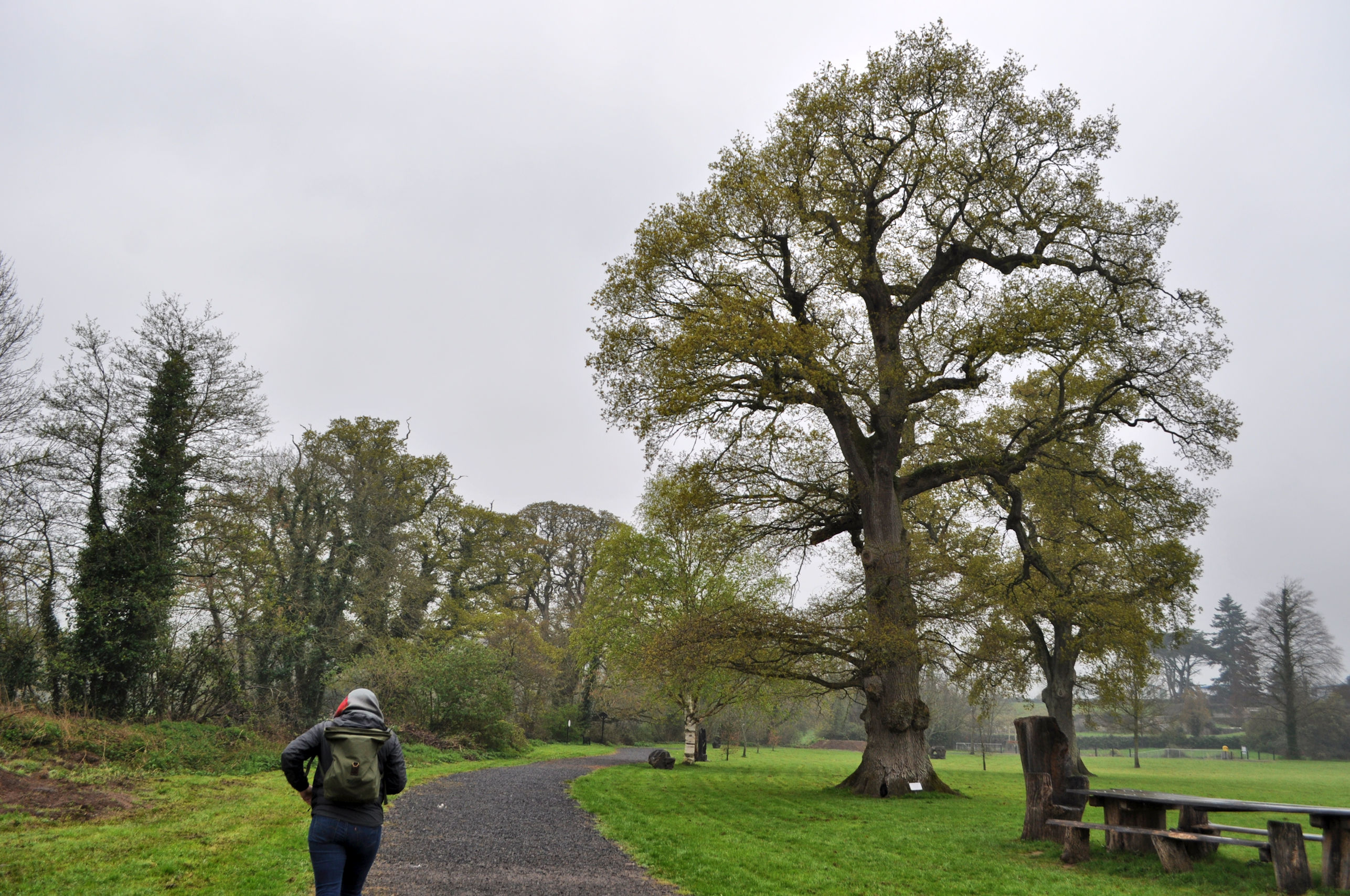 Our guess at how to approach the castle was incorrect, but serendipitous, as it led us through the grounds in a wide circle behind the castle. It was still raining and foggy, but had warmed up, and we were in good spirits as we walked the grounds and got soaked again.