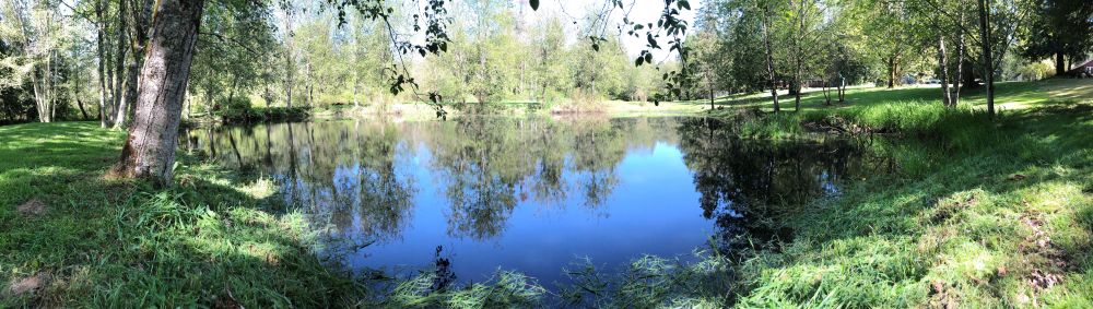 Panoramic view of my pretty yard, with the pond on the left and house on the right.