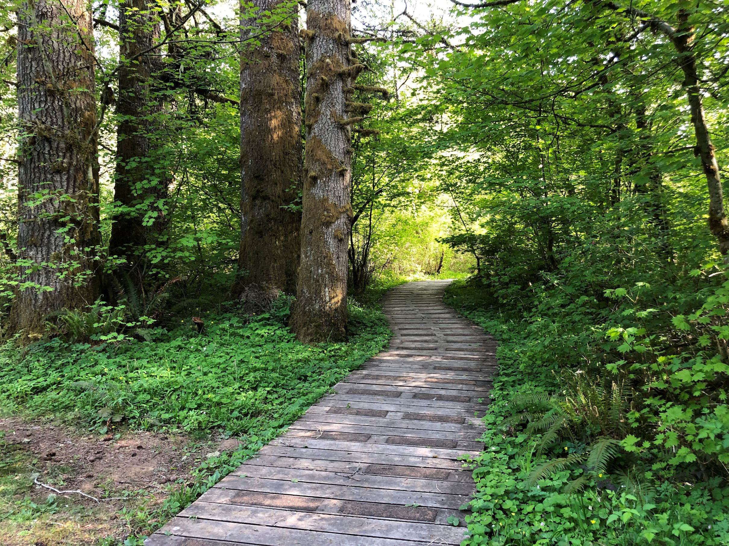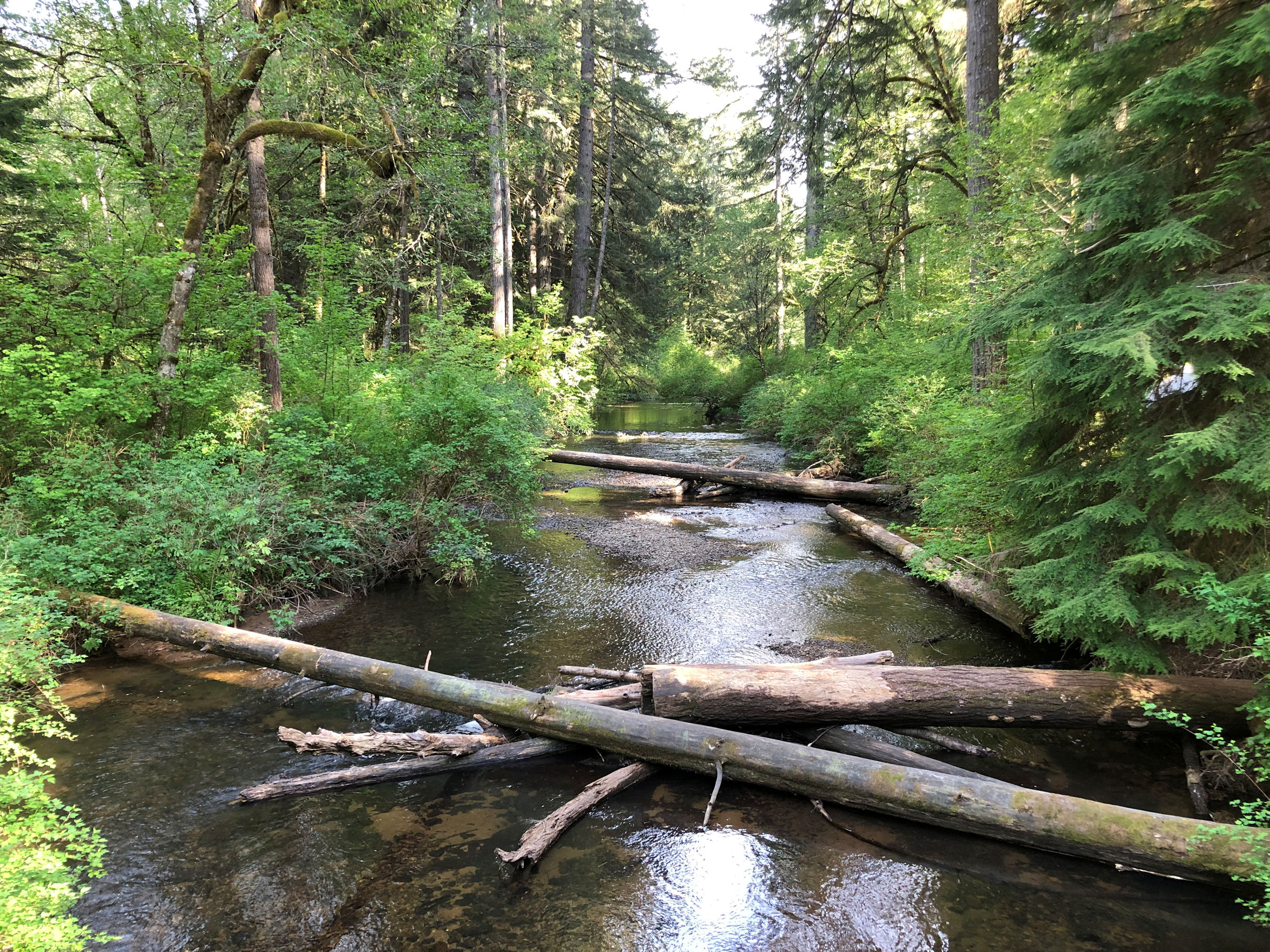 We had a laid-back evening, exploring the campground a little. There are trails of many lengths that begin from the campground itself, from a one-mile nature trail crossing two small creeks, to a 7.2 mile loop past 10 waterfalls. It was perfect. That evening we walked to a wooden covered bridge over a walking path across the Silver Creek South Fork. We explored nearby campsites to find the best one for next time, and then we went walking on the nature trail.