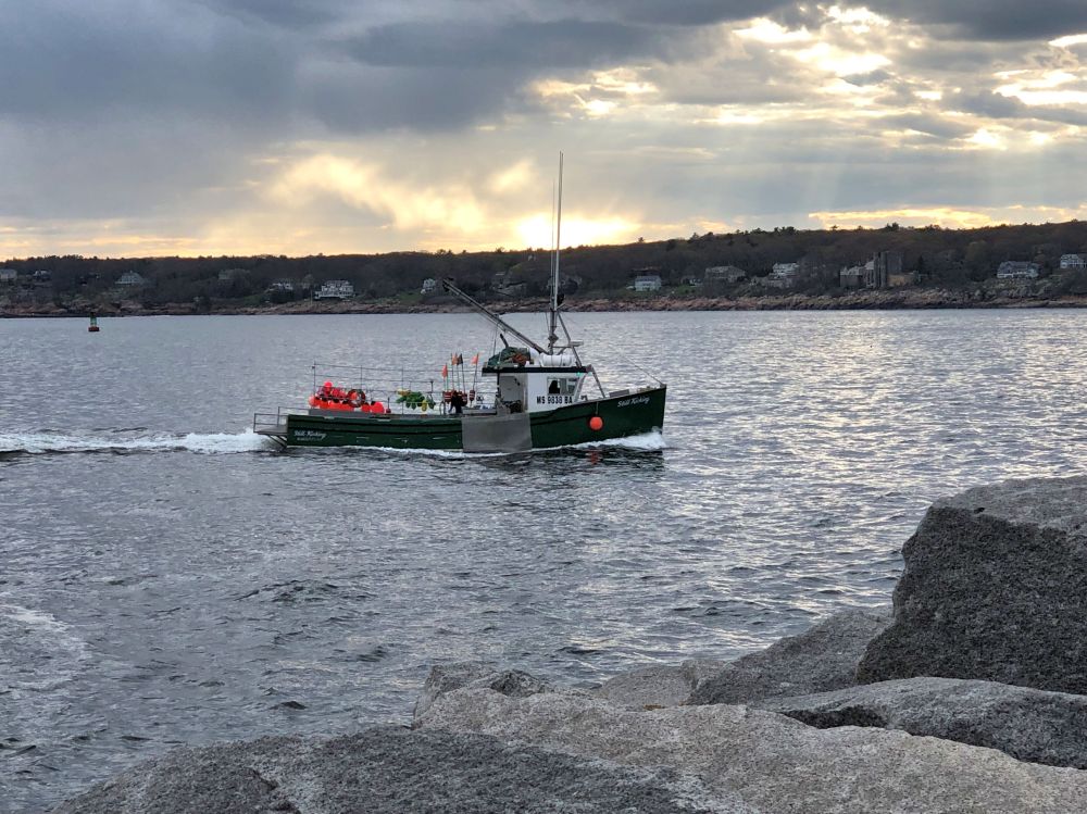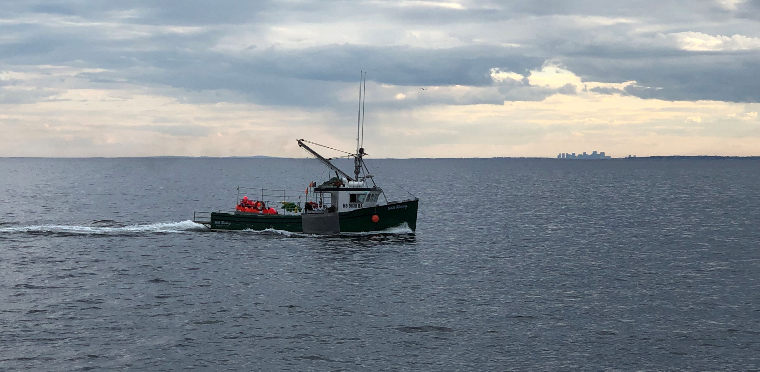 The fishing boat Still Kicking approaches, with the Boston city skyline visible on the horizon.
