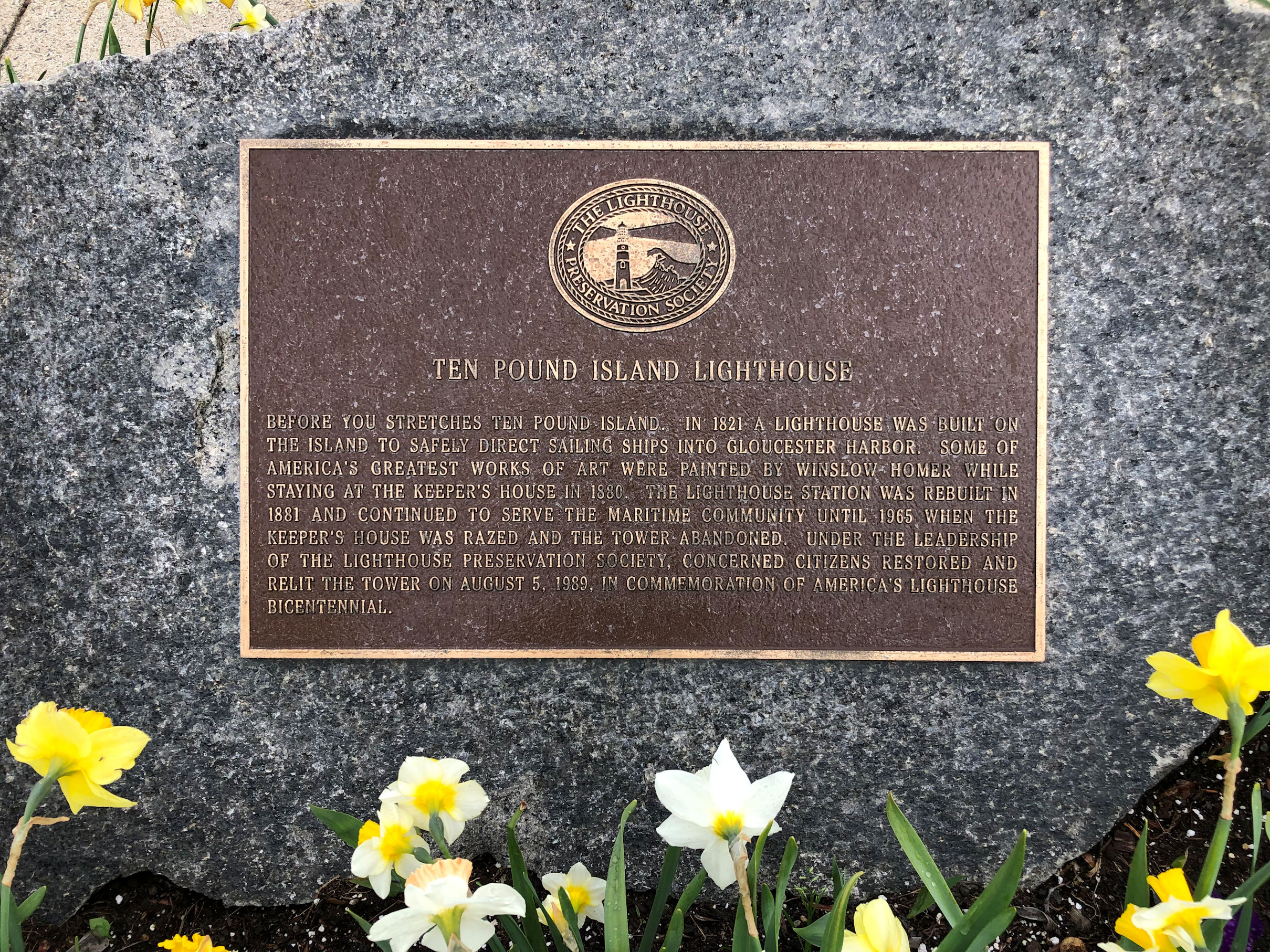 We saw a plaque for the Ten Pound Island Lighthouse, which the Hurricane II passed close by earlier in the day. Though the website for Eastern Point Lighthouse claims that Winslow Homer lived there, it looks rather that the famous painter lived with the Ten Pound Island lighthouse keeper in 1880. While there he painted harborscapes that remain famous today.
