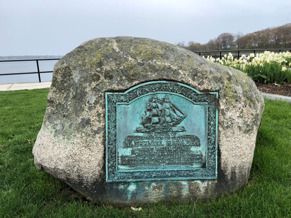 “In honor of an intrepid son of Gloucester, Nathanial Haraden, sailing master of the US frigate Constitution, commended for gallantry in action at the seige of Tripoli, August 3, 1804.”
