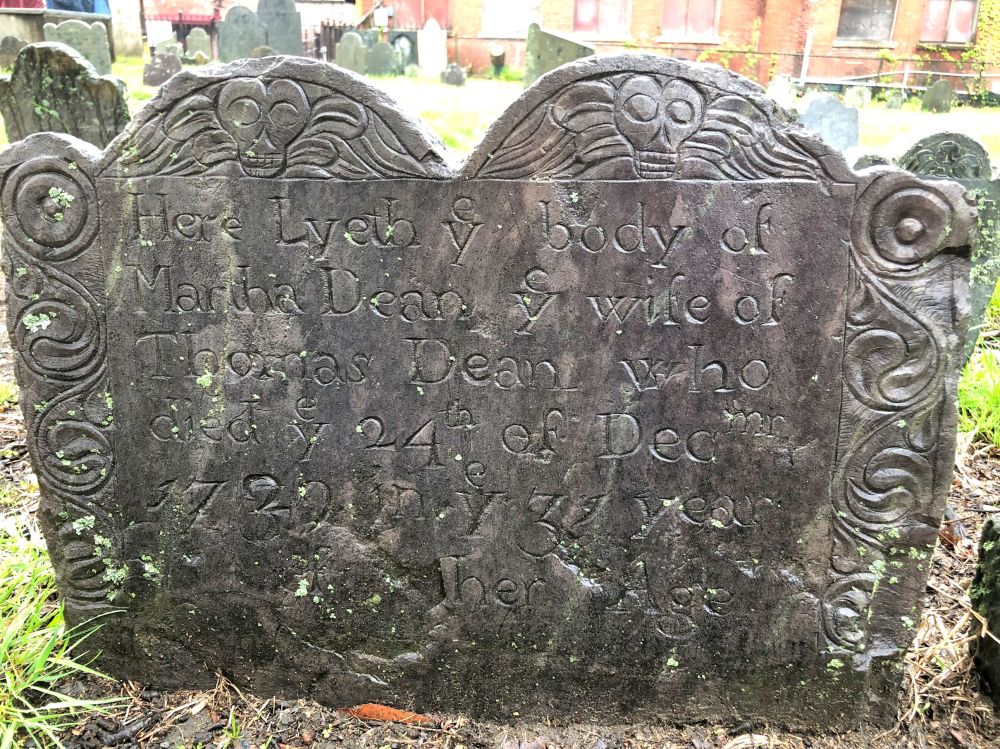 A typical gravestone in The Burying Point. Mary Groue 1683