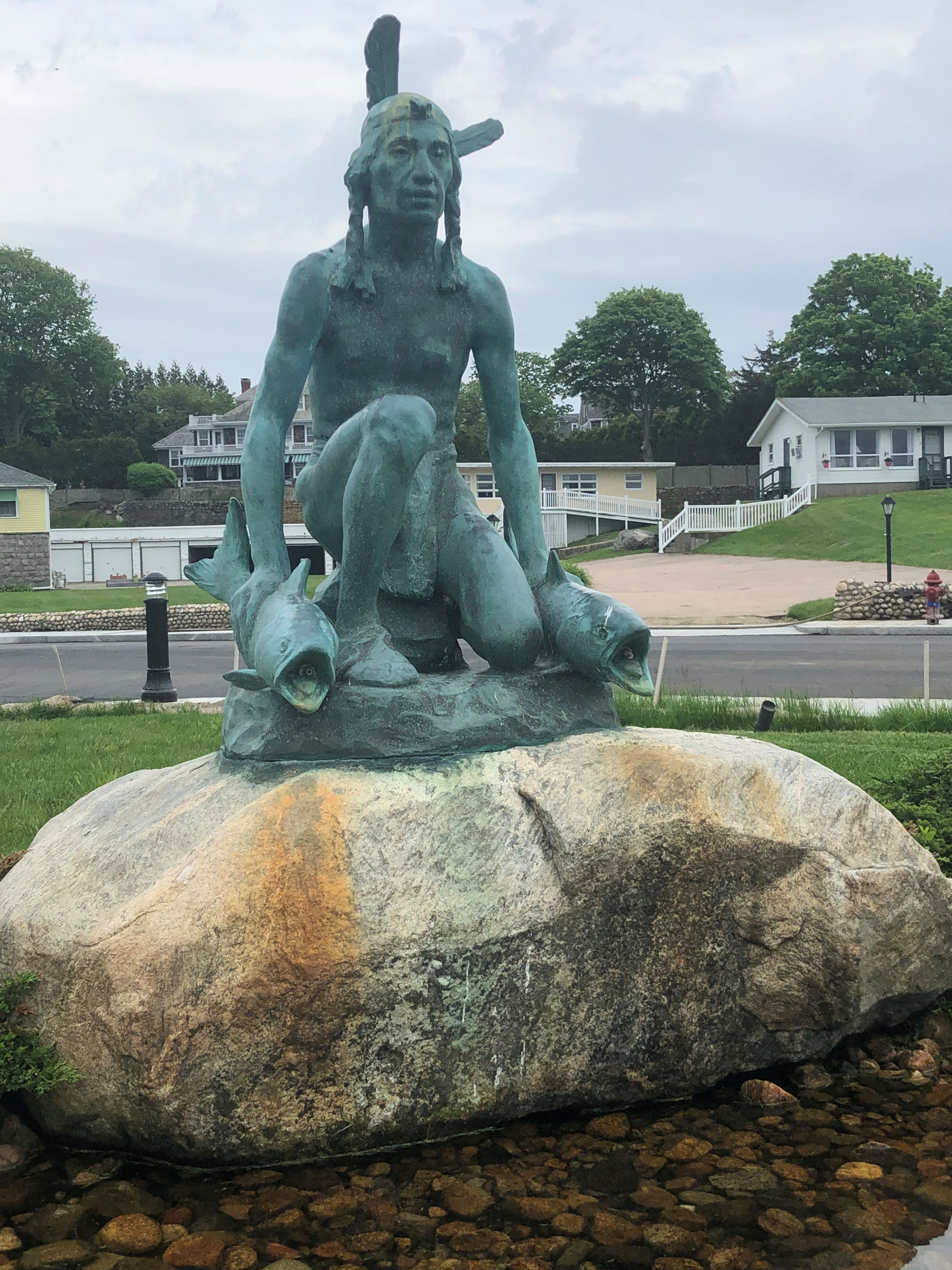 We explored Watch Hill next, the southwesternmost point of the state of Rhode Island. In truth, after Watch Hill is when we undertook the Cross The State Journey I mentioned at the top. You can see how that makes sense by looking at the first map. In Watch Hill we found more monuments and another seafaring community taking pride in its mariner history. One monument caught my attention because it is of an Indian. It contains no explanation and no context at the monument, so I was compelled to look it up and investigate.