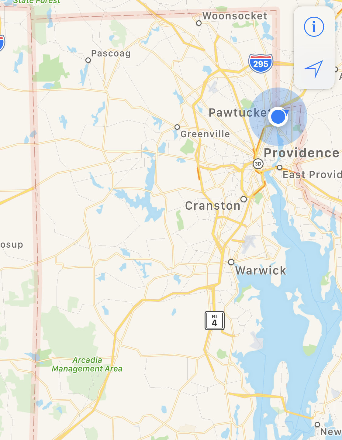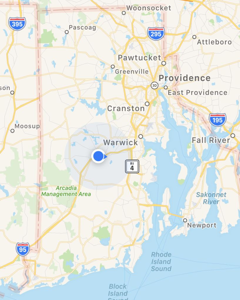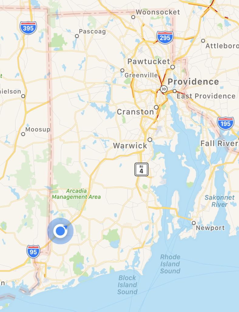He chose a diagonal route that would make sure we gave Rhode Island the benefit of the doubt. I started the stopwatch on my phone, and took screenshots of the route too.