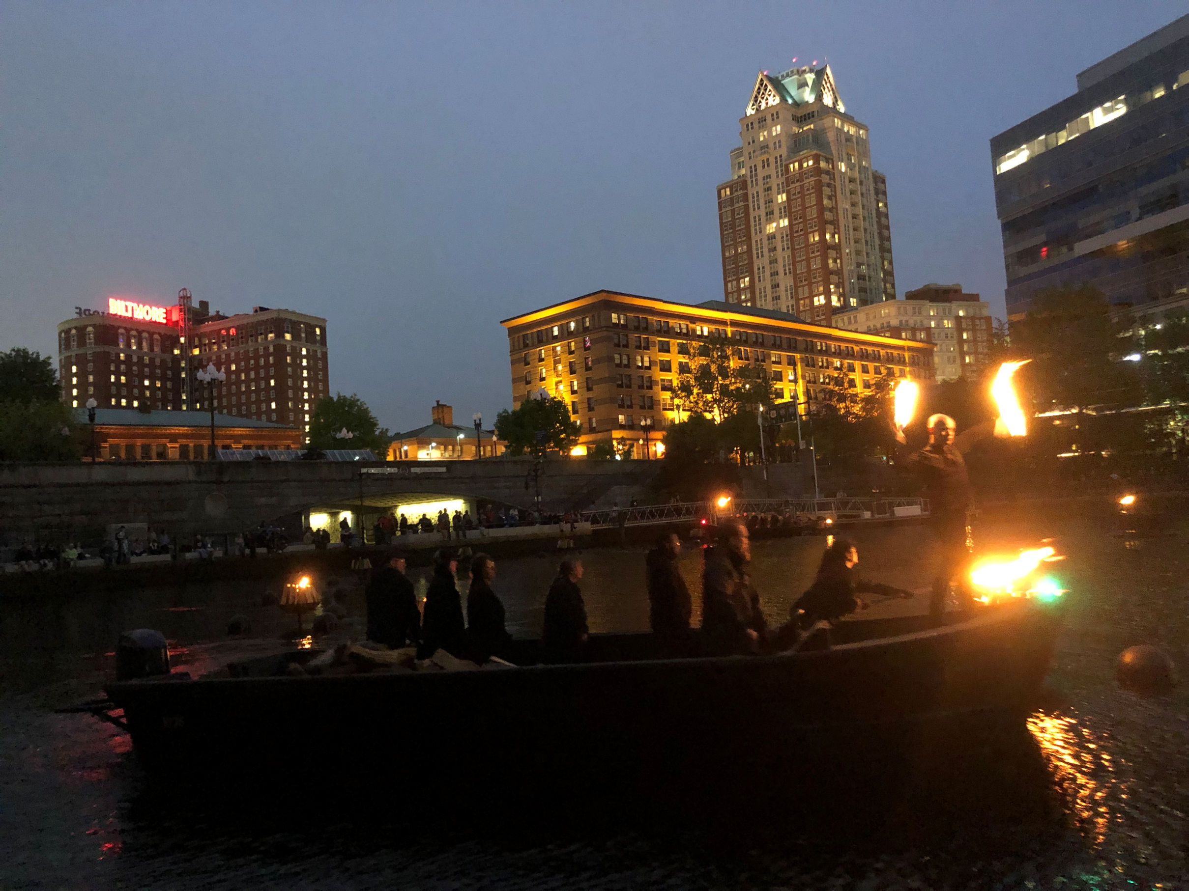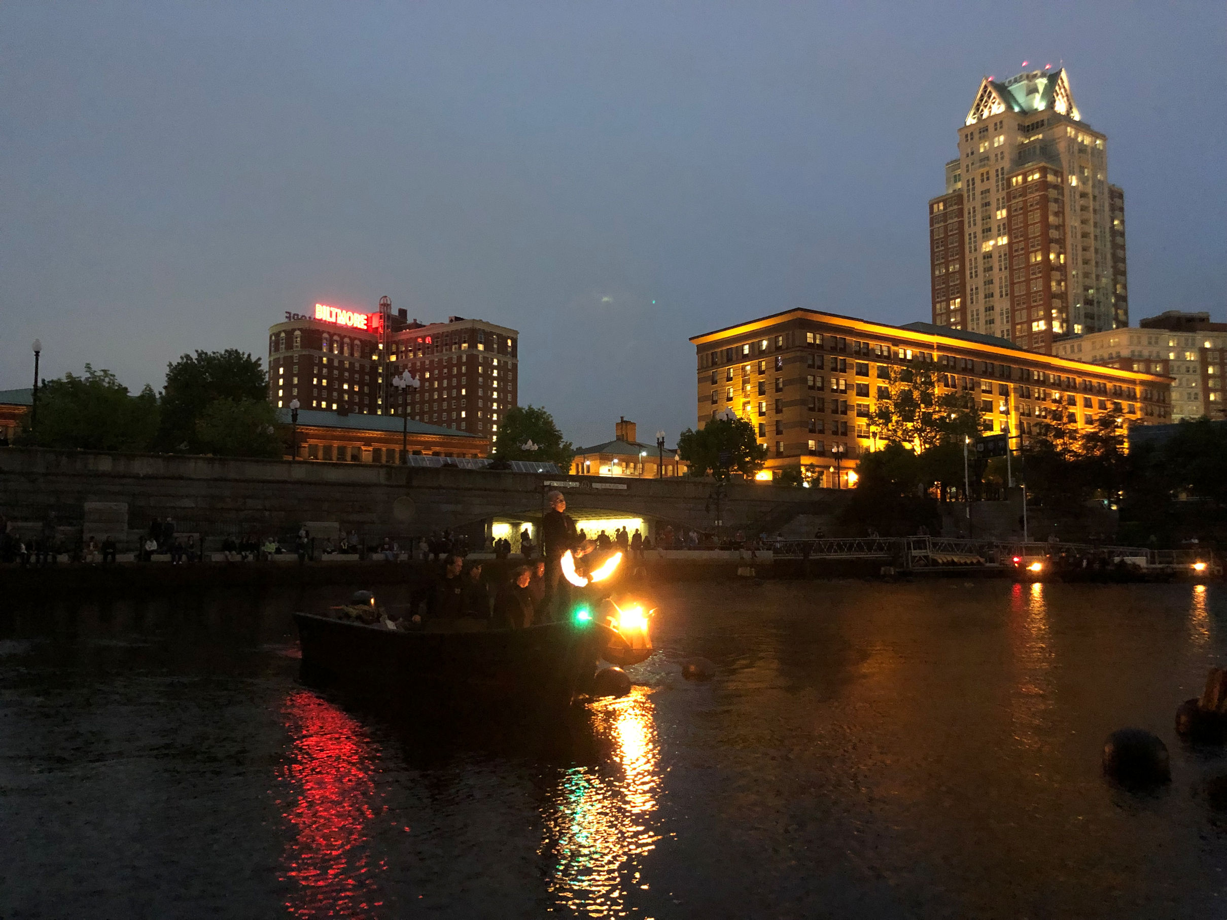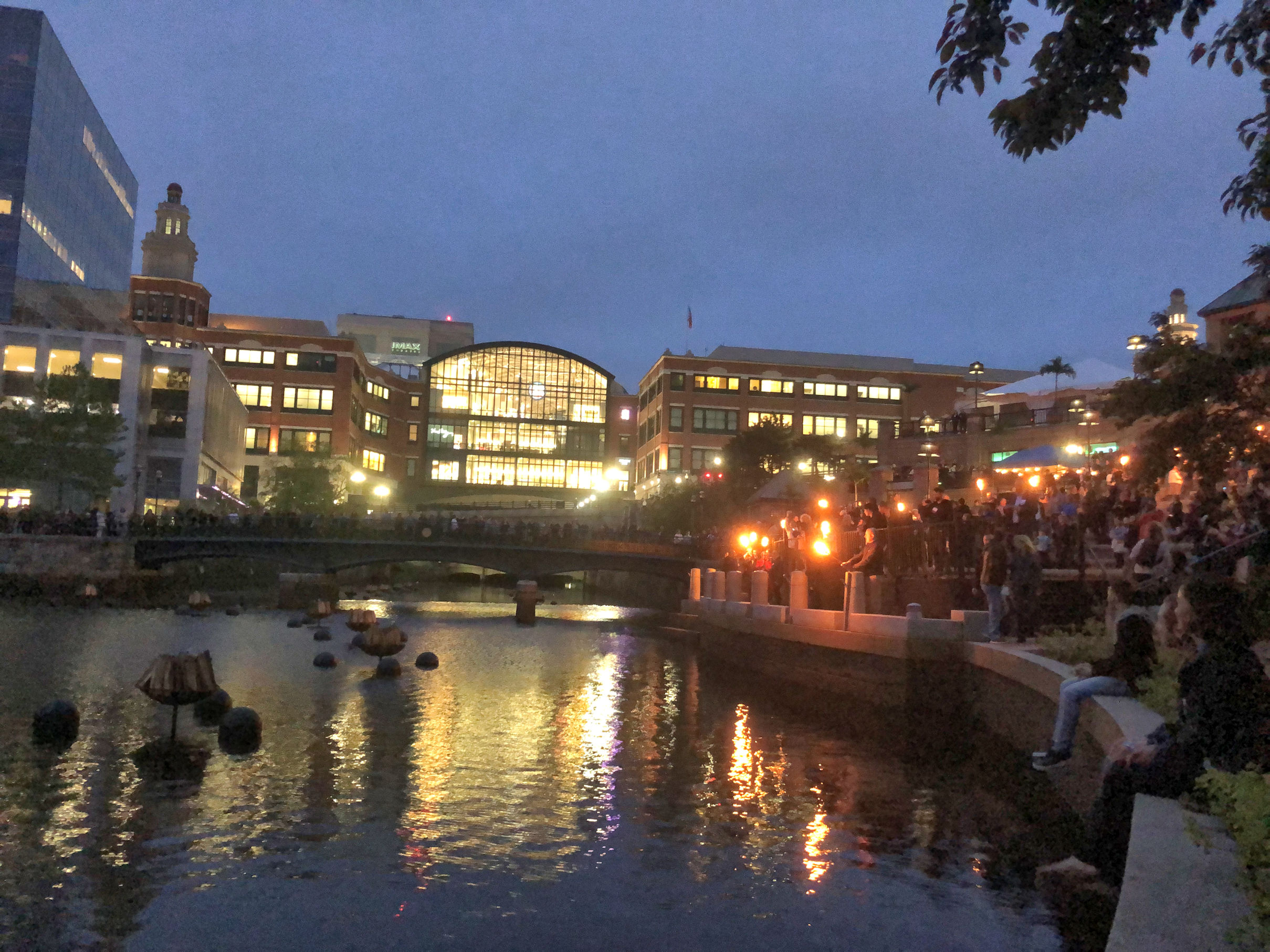 Waterfire in Providence is a very big deal. The event bills itself as an art installation under an arts promotion and awareness organization, with the ceremony I saw as its centerpiece. As the summer temperatures warm the nights, it becomes more popular and more braziers are added, lengthening the display across more of the city’s downtown rivers. There are 100 braziers in the middle of the season. It seems that almost as many local people get excited about volunteering to help as watching it, and in that way it has been an ingenious way to rebuild the life of downtown Providence, and bring in millions of tourists.