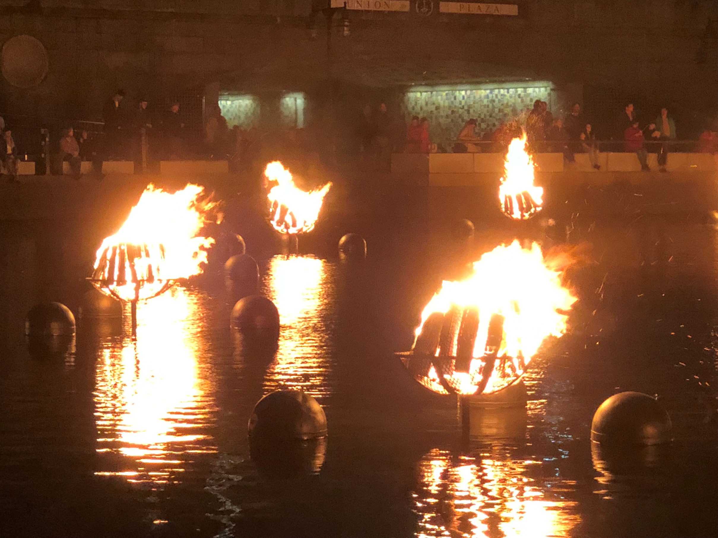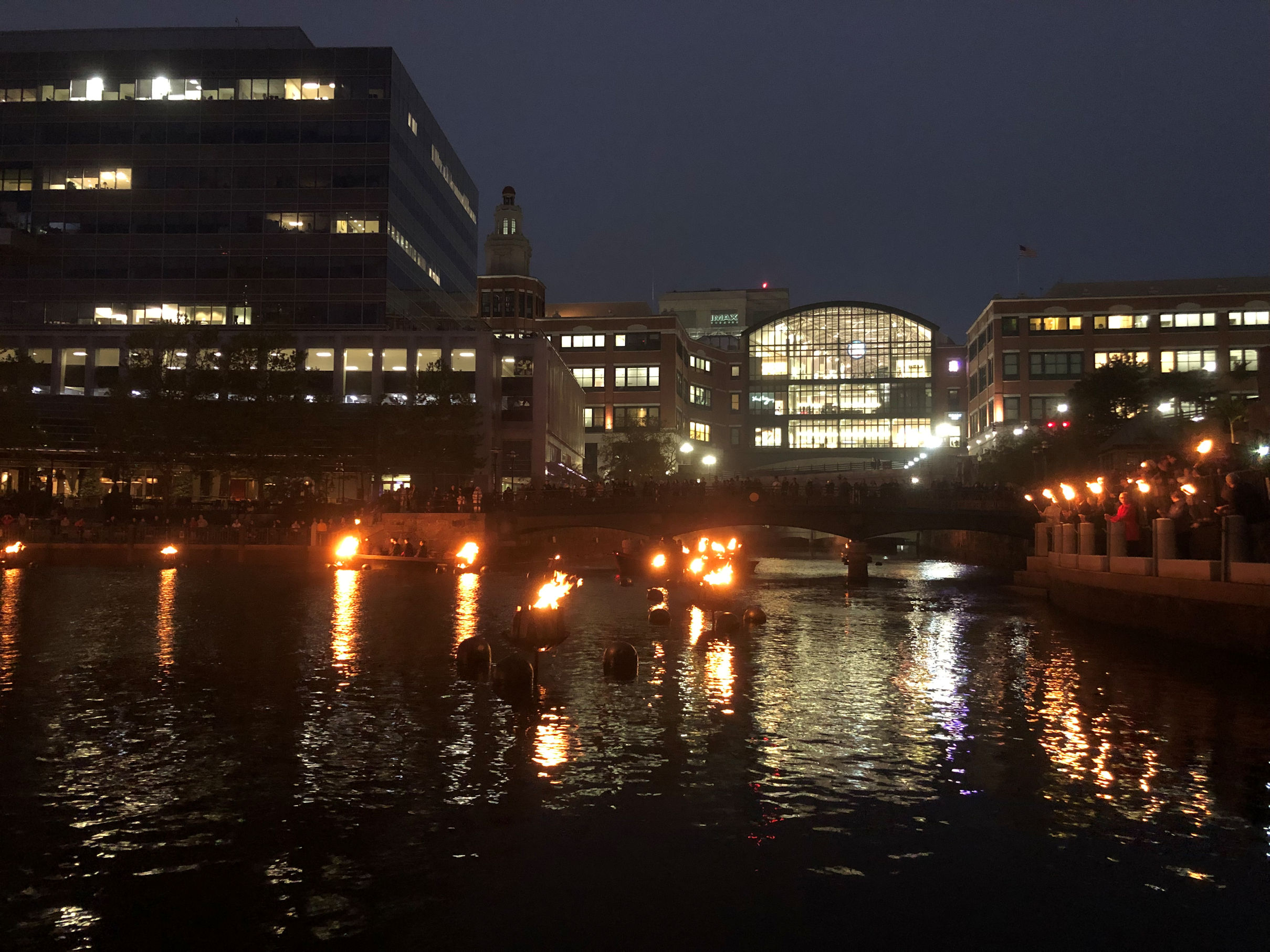 In the center of town, floating braziers are anchored all around the Woonasquatucket River, right before it converges with the Moshassuck River. Aren’t those names great?! When we arrived, the braziers were already loaded with wood. When it got dark, mood-creating music from around the world boomed through the crowd. It grew chillier and darker and finally black boats filled with people dressed all in black came silently drifting through. People from the crowd came down to the waterfront on our right and lit torches and stood waiting. The boats passed in front of the holders of the fire, and had their own torches lit. One boat had a man twirling fire poi. He stood confidently in black and spun the fire balls around himself, with flames reflecting off his bald head. It was so dramatic.