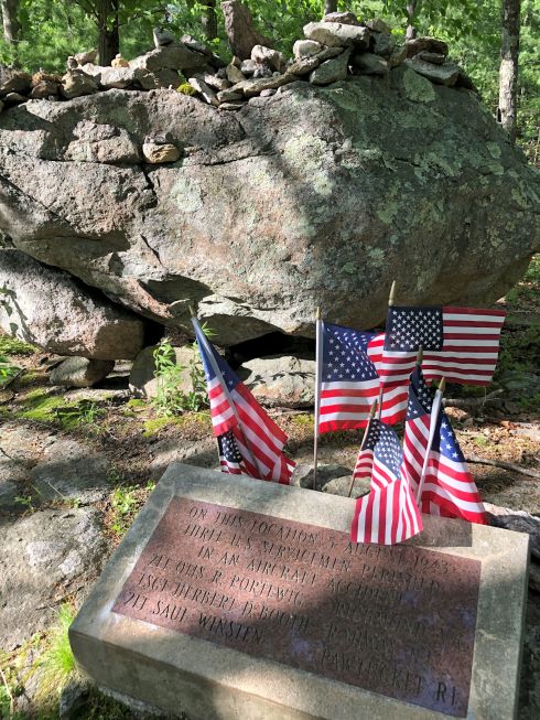 All too common at the time, there was an engine failure and the airplane they were flying plummeted, landing here and deposting part of the fuselage onto that big rock. The rock now holds small rocks that people have placed in honor of the servicemen. Now I understood why a memorial was in such an out of the way place that was difficult to get to. There is another memorial in town, for people who cannot make the trek.