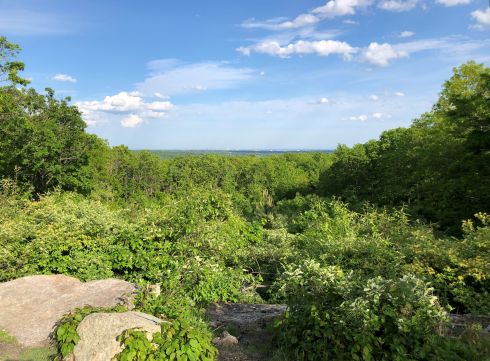 And viola! We crested near a broken down chimney. Someone had built a house up here and enjoyed the spectacular view for a while. Likely the only thing remaining was the thing that got rid of the rest of the house. We sat down on a rock and looked out over the high buildings of Providence that we could see over the tops of trees. Someone doing trail maintenance had cut down all the trees in front of us so that the view was not blocked.