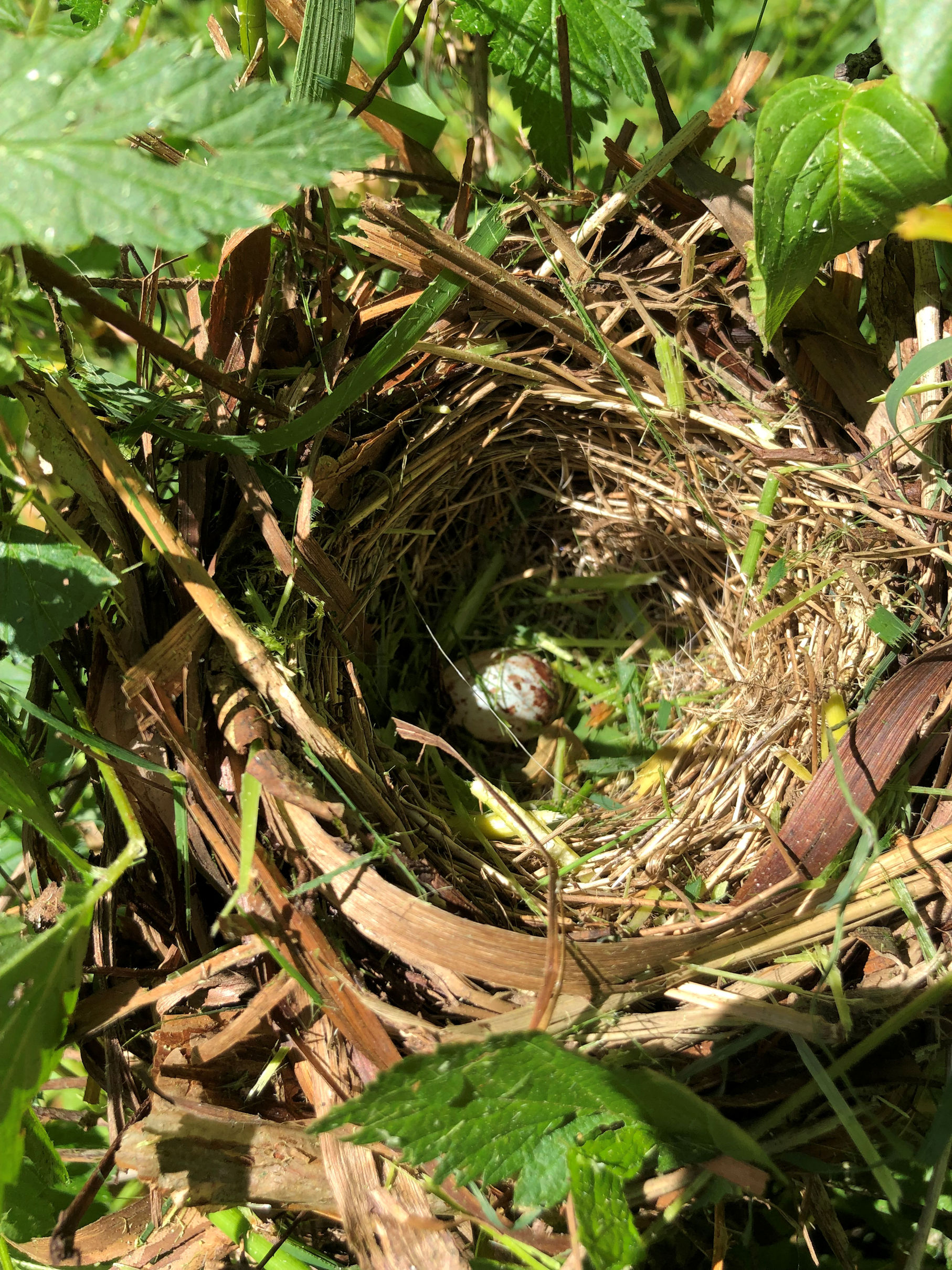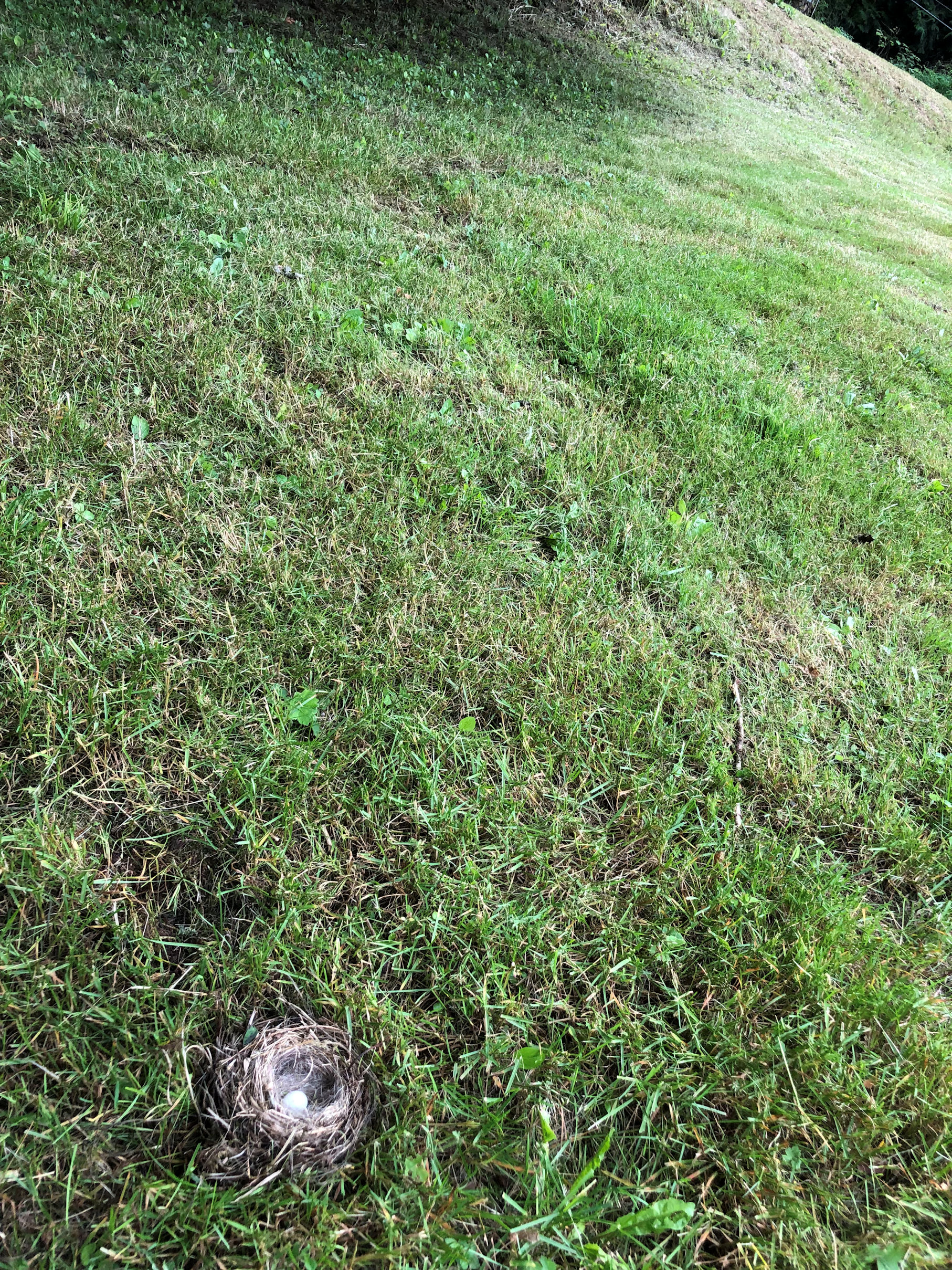 There were no trees above that it had fallen from – it had been built right there on the grass. There were no trees or bushes close enough that I was sure the parents would find the nest if I moved it. It was a very bad location with no camouflage. At a loss, I laid the nest back exactly where I had found it. The very next day the egg was gone. I had known it would be.