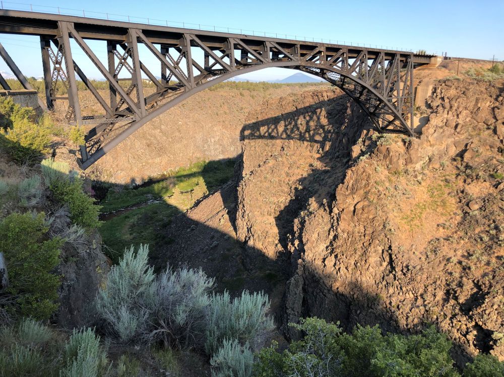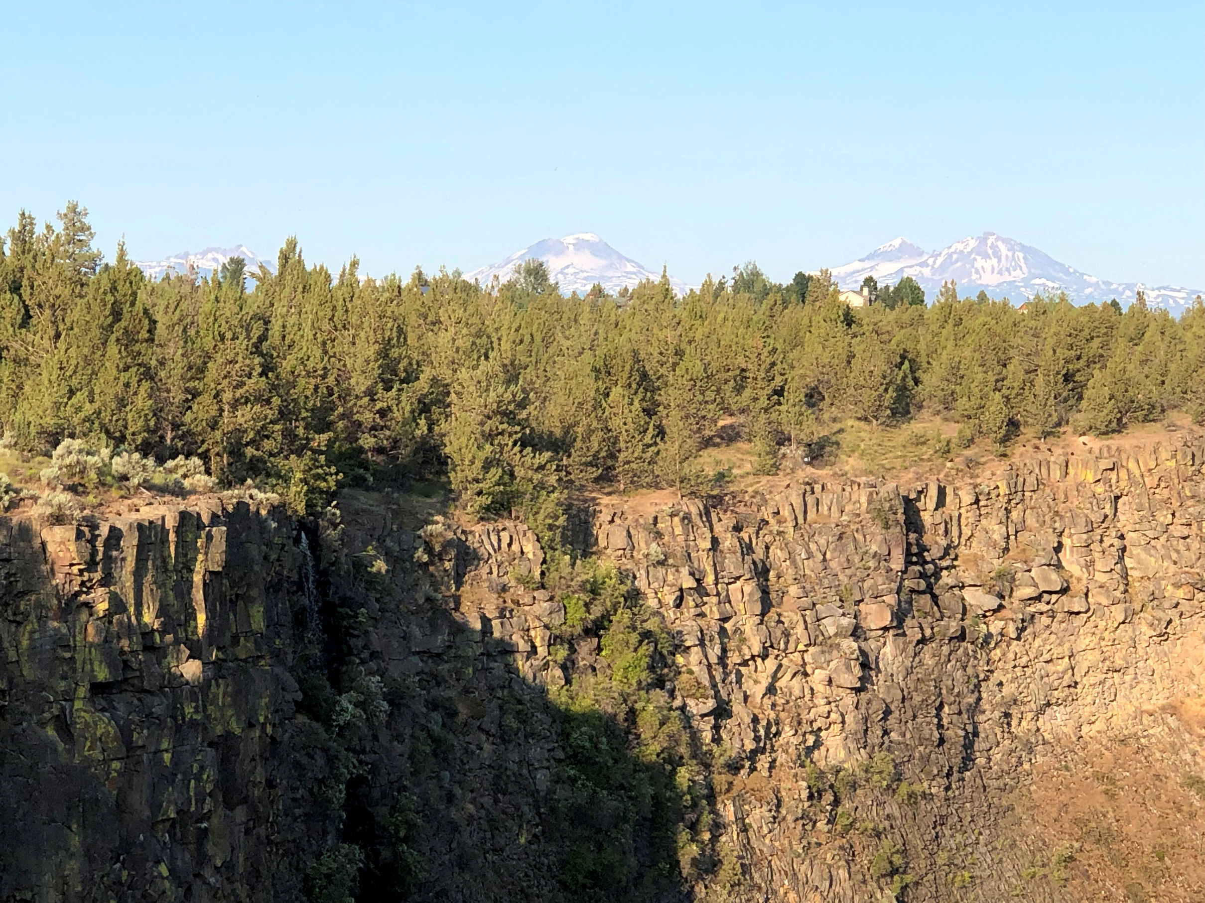 The next morning I left early in order to get home early, but I simply was not able to drive past Peter Skene Ogden State Scenic Viewpoint without stopping. From the highway I could see the snowy peaks of volcanoes and wanted to pull the car over so I could get a photo. Early in the morning, I could access the parking lot, but the road to the cliff was still gated. I parked and walked through the dewy grass, fretting a little about the time I was wasting by stopping to look. But oh, it was worth it.