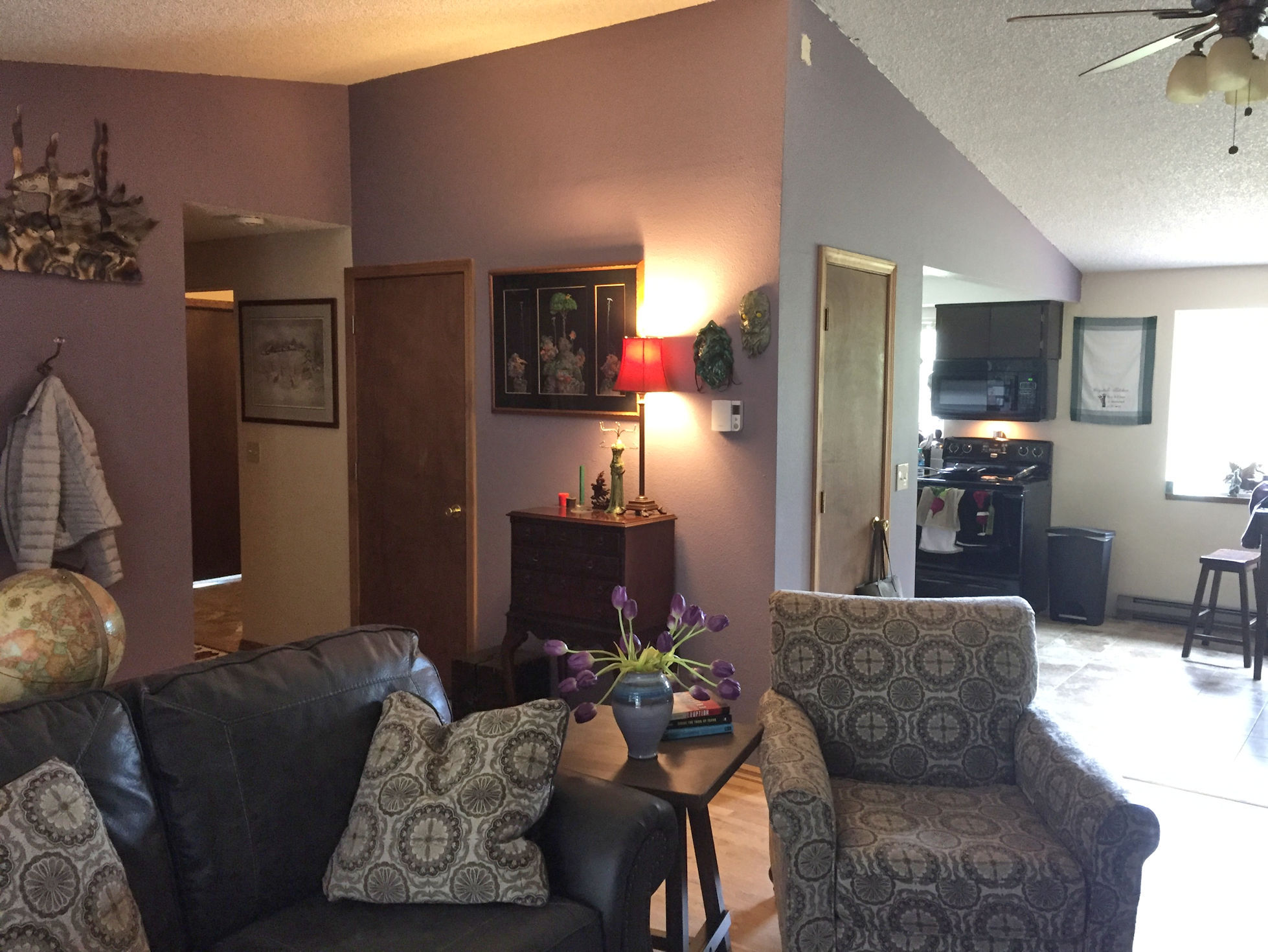 This photo is from last spring. I’m standing in the front room, facing a wall that holds a utility closet and a pantry. Behind all that (you can see the stove and microwave) is the tiny galley kitchen.
