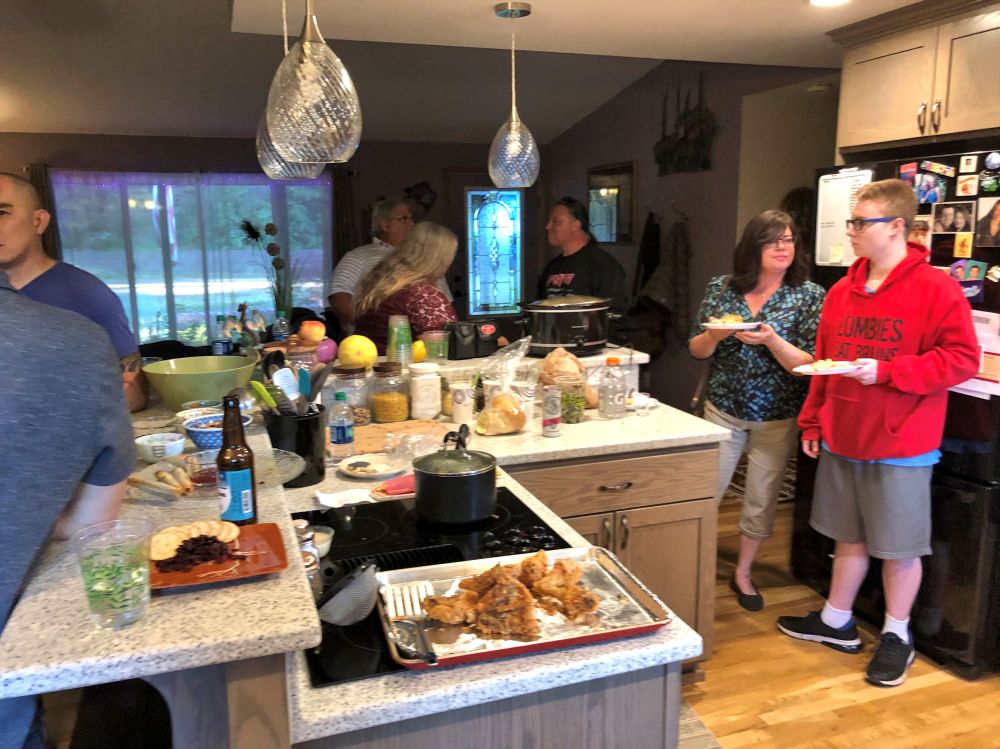 Tara wanted to have a big 22nd birthday party at my place in July, and said it was ok if I invited a bunch of my friends (since most of them know Tara anyway) and had a kitchen-warming party at the same time. Tara’s partner, Brynnen (orange hair), came over, and Tara’s best friend also came over the night before, and they insisted on making dinner. I unhesitatingly agreed.