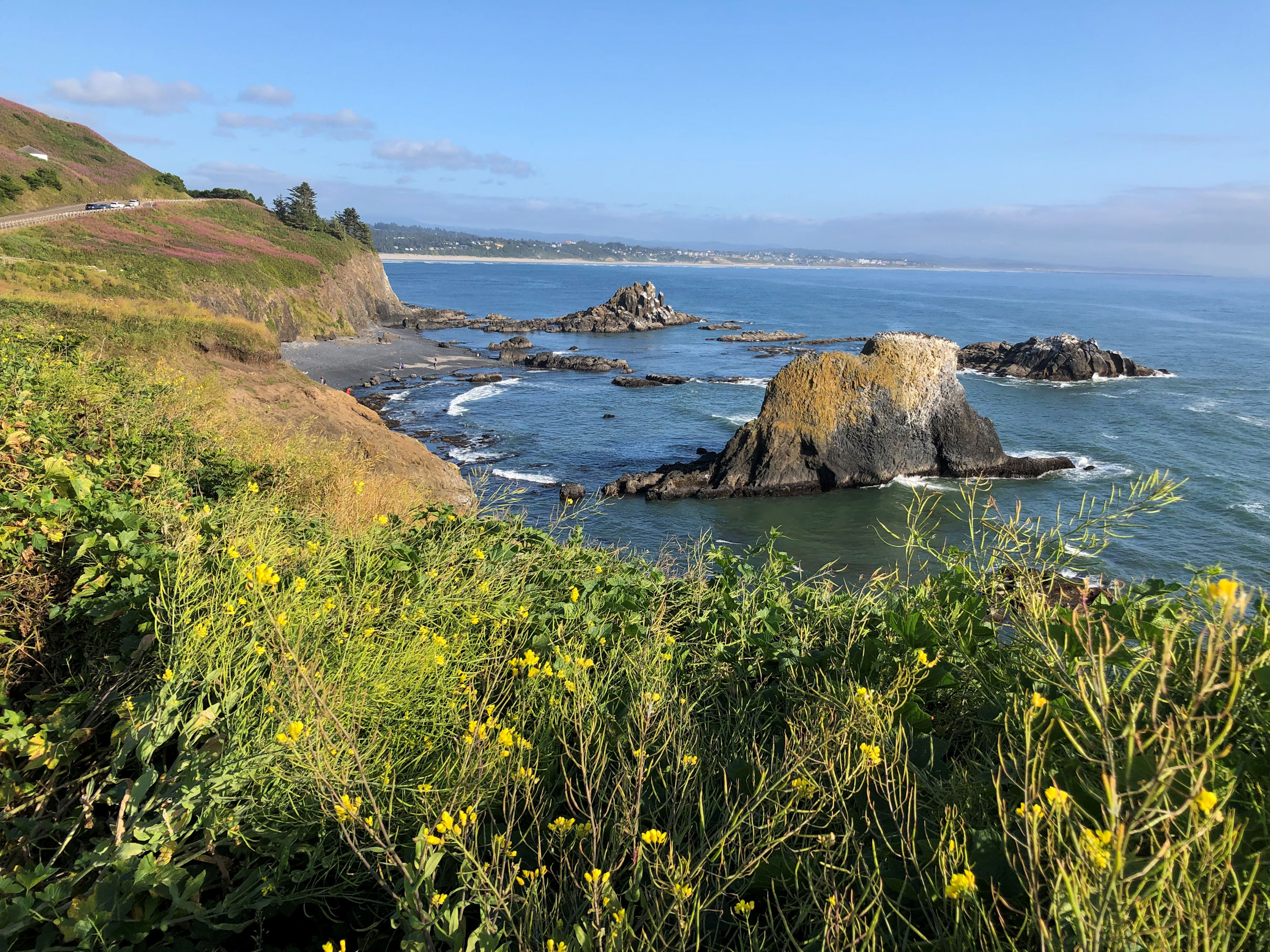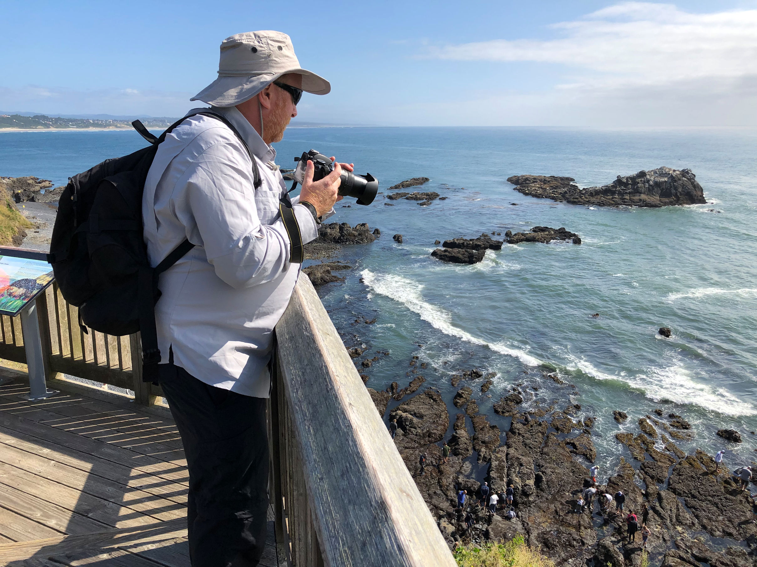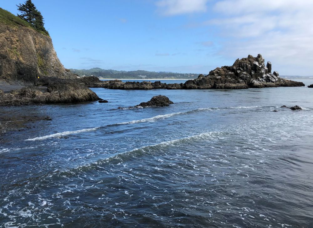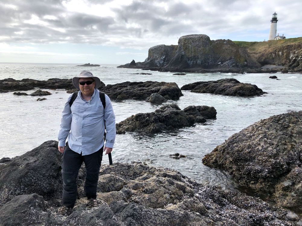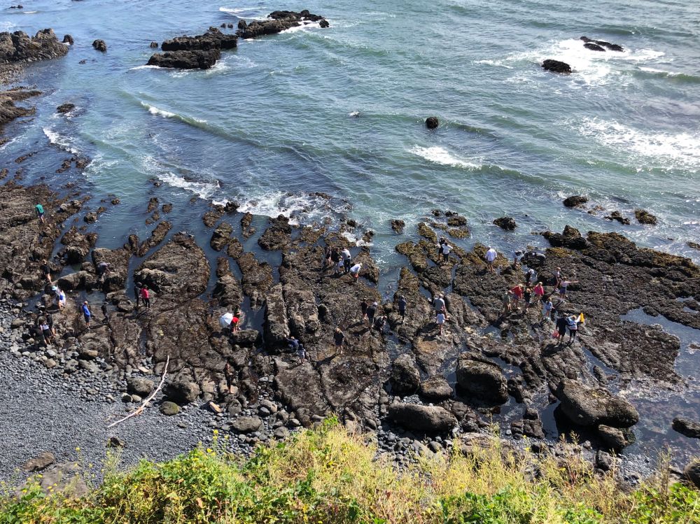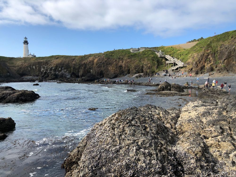 When Jim came out to the coast to visit from his home in Minnesota (halfway between the two US coasts), he had his hopes pinned on tide pooling. For those who haven’t done it, tide pooling means finding a beach that has pools left on shore when the tide drops. After the tide is out, you can explore the pools and see ocean wildlife up close and personal. I told Tara our plans, and Tara enthusiastically suggested Yaquina Head Outstanding Natural Area. The U.S. Burea of Land Management oversees this natural area, and interpretive guides were on site to keep people out of restricted areas, but also to answer questions and help us get the most awe and wonder out of our day.