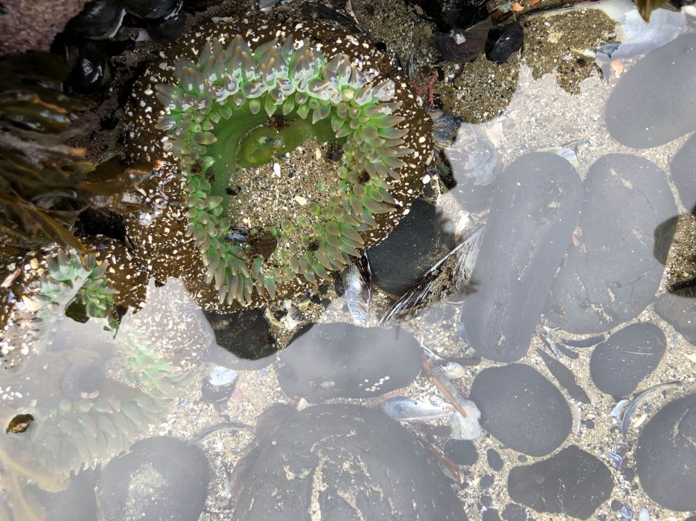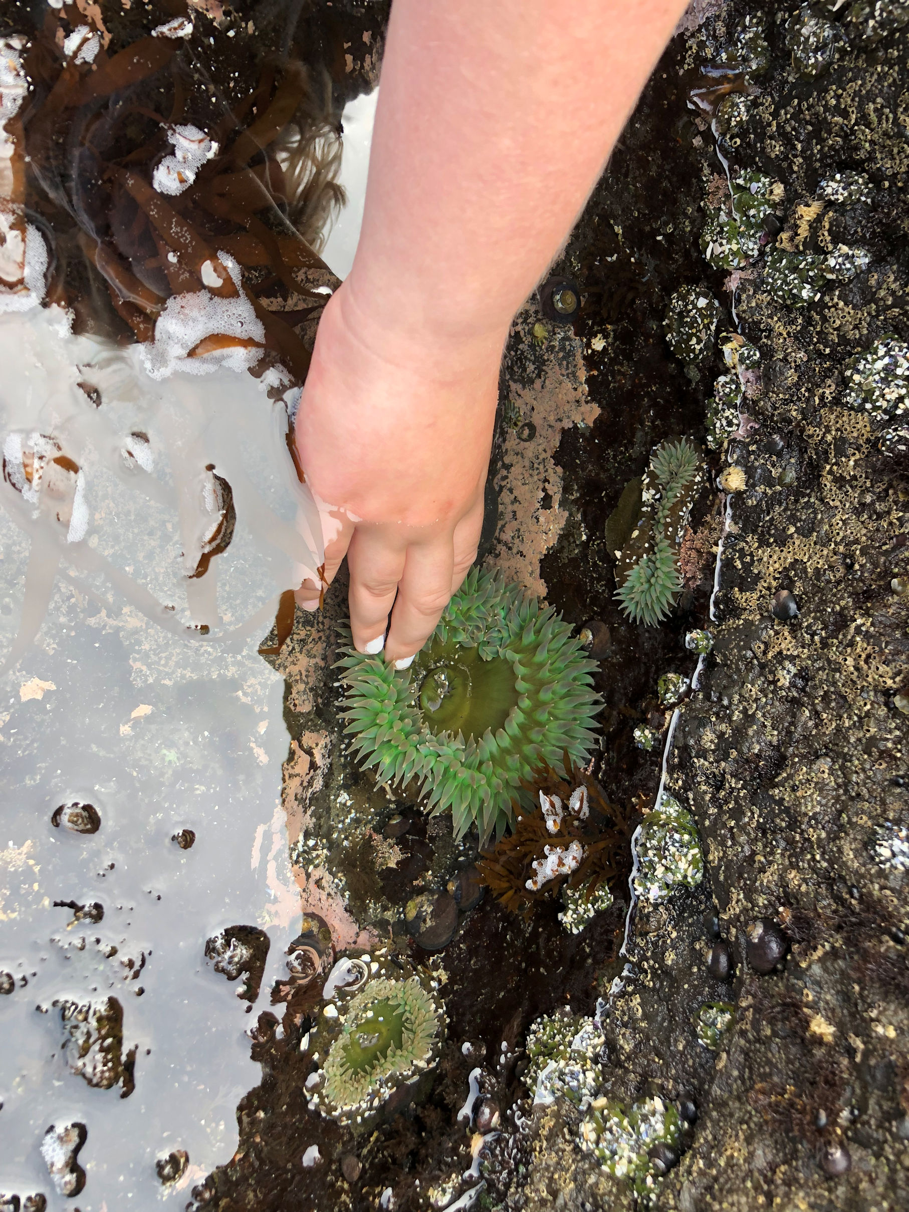 The mood on the beach was effervescent. I think that was because so many kids were there, genuinely enjoying the outing, and so many adults were allowing themselves to get into the spirit of discovery and delight. Even teenagers in packs were climbing around the rocks, discovering things and calling their friends over to see. It made people talkative with each other, while we shared the common experience. I asked a mom if I could photograph her daughter’s little hand with white fingernail polish while she showed me how to touch an anemone. The mom gave permission, and then remarked at how it had not even occurred to her to be protective of her child in that environment. “I think people are safe here,” she decided. I agreed.