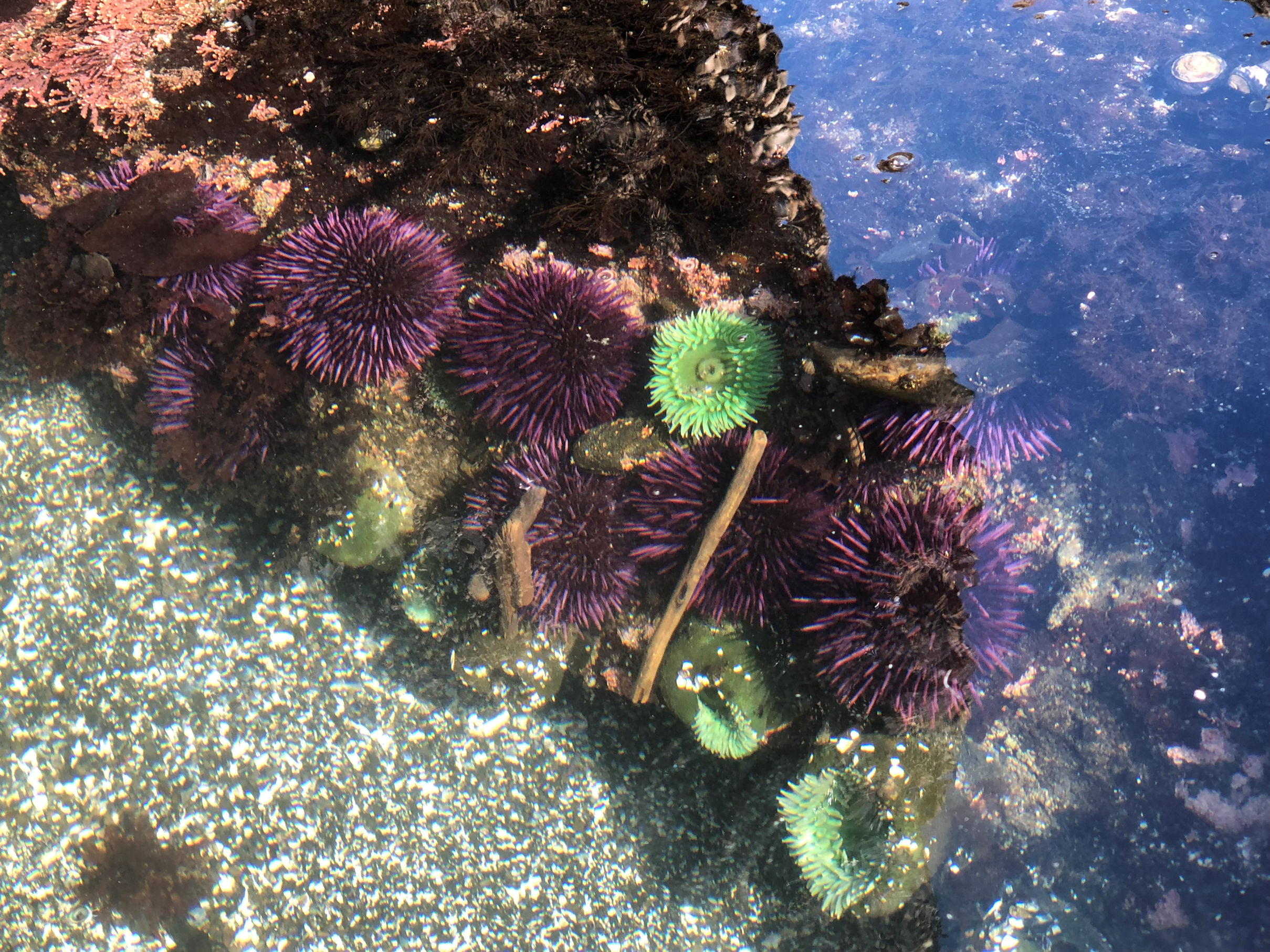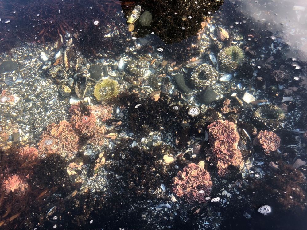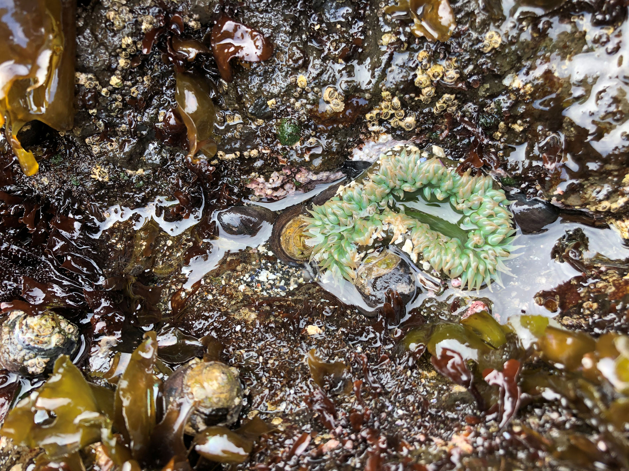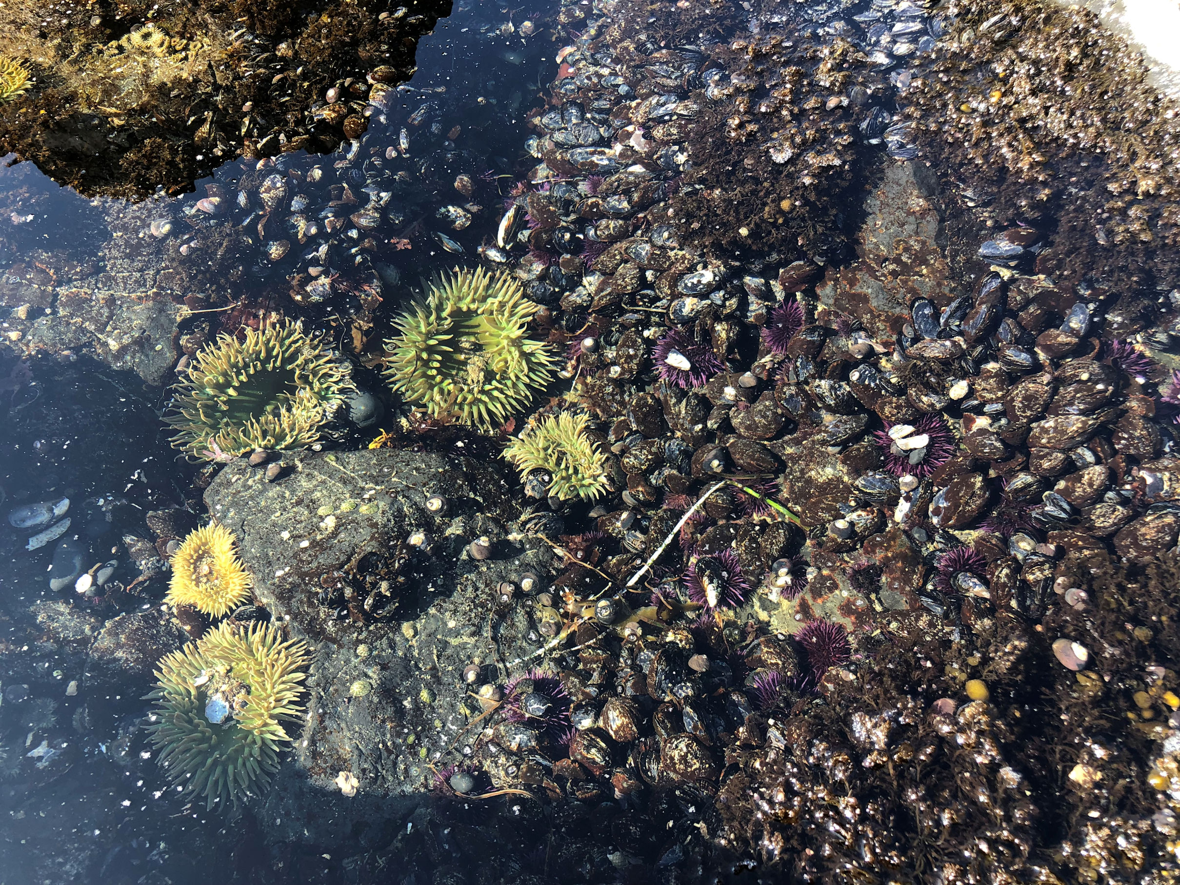 We hit the beach at about 20 minutes before lowest tide, which is perfect. The weather had improved all day and became warm down on the rocks where we were protected from wind. The bright sky did provide a serious photography challenge. I was pleased when I could find rock shadows to counteract the shine on the surface of the water.