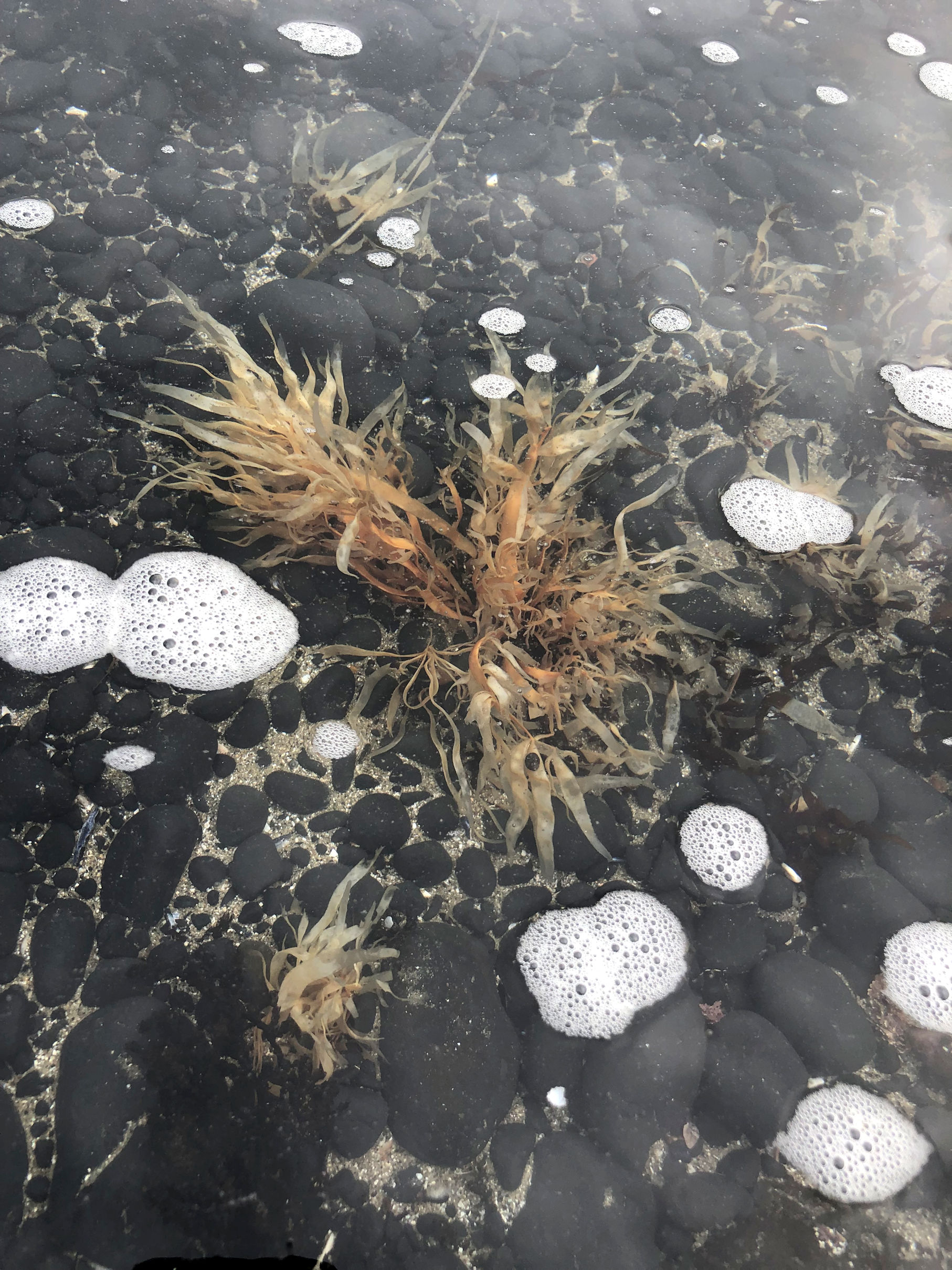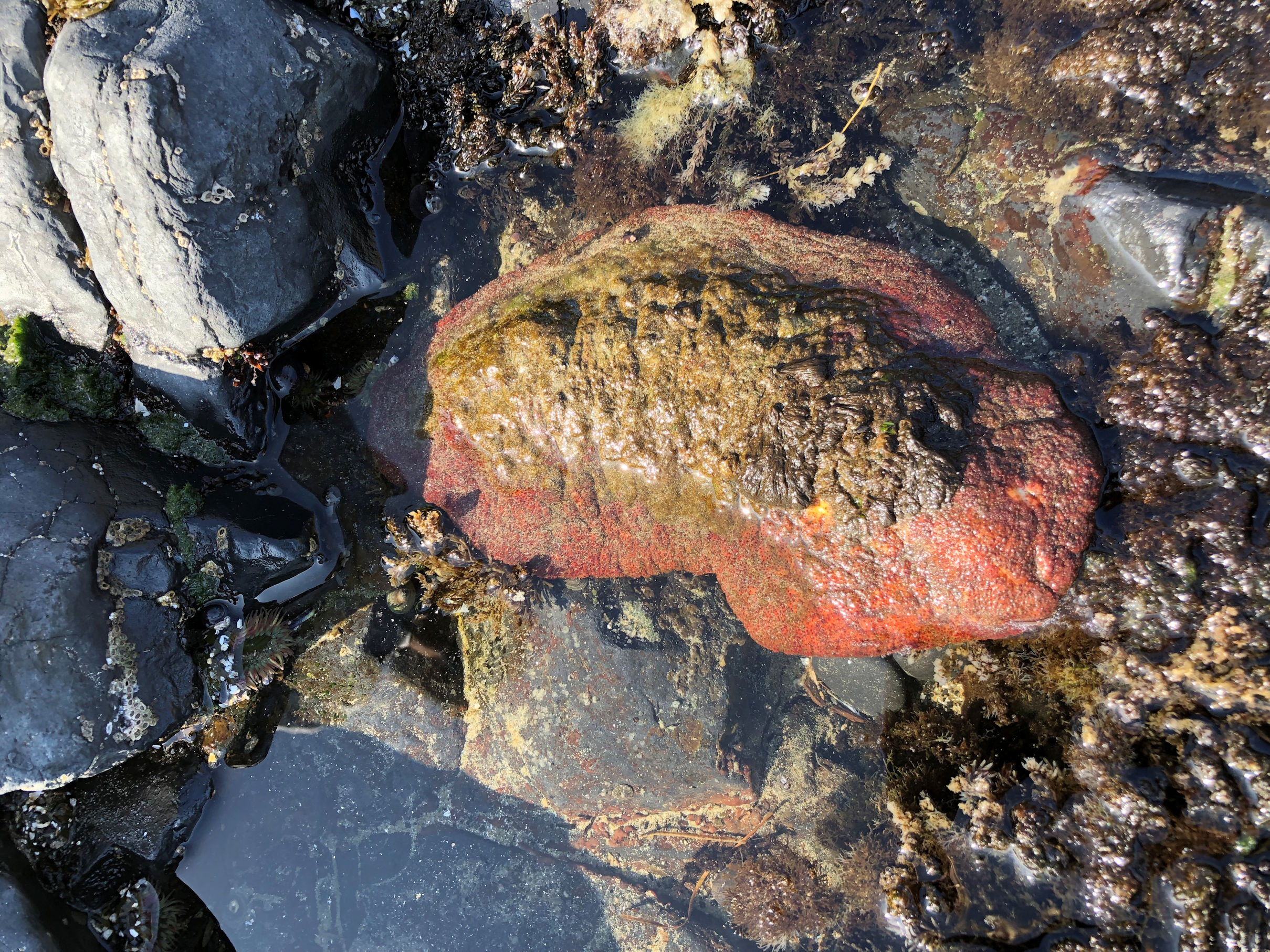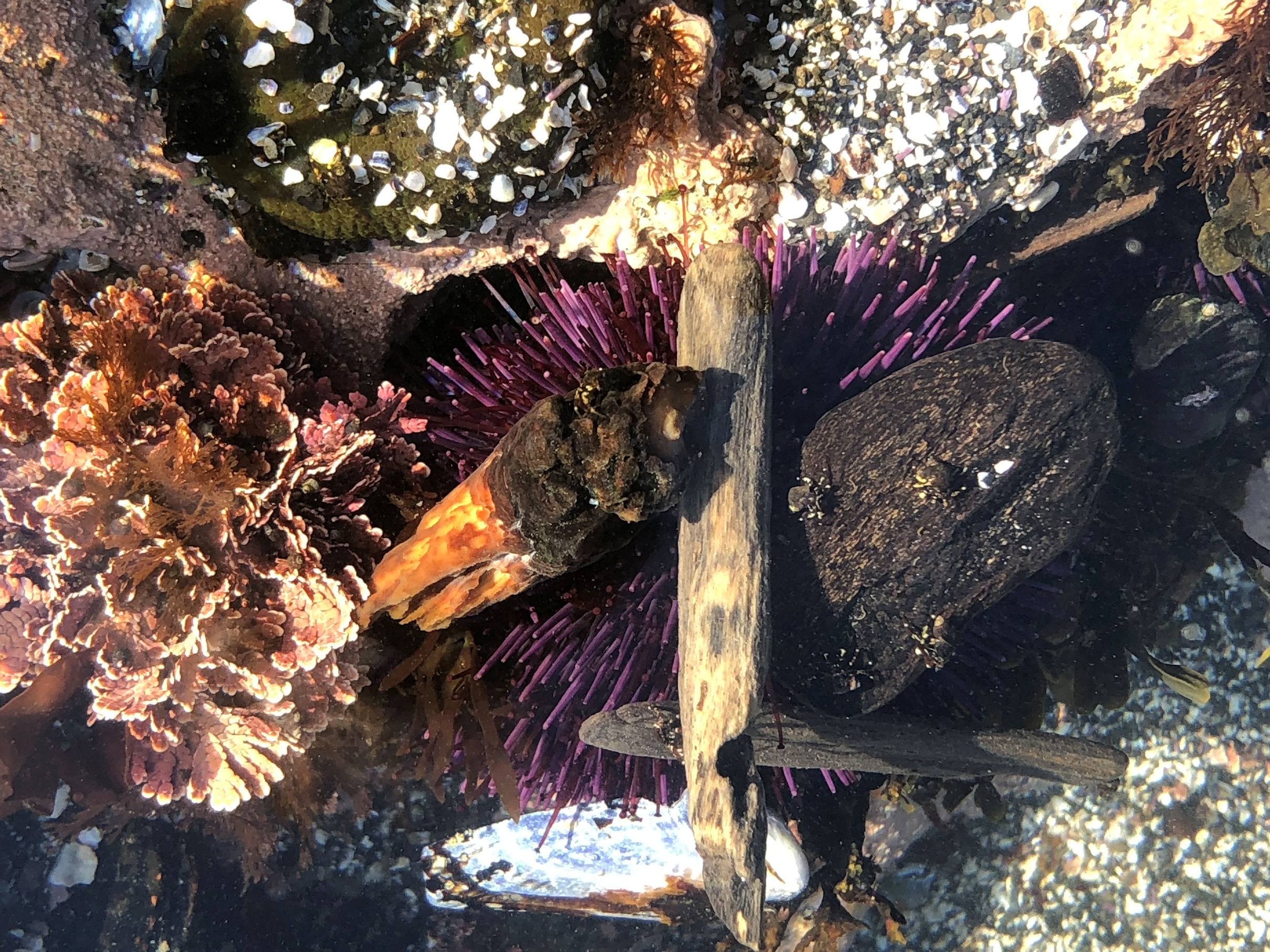 We hit the beach at about 20 minutes before lowest tide, which is perfect. The weather had improved all day and became warm down on the rocks where we were protected from wind. The bright sky did provide a serious photography challenge. I was pleased when I could find rock shadows to counteract the shine on the surface of the water.