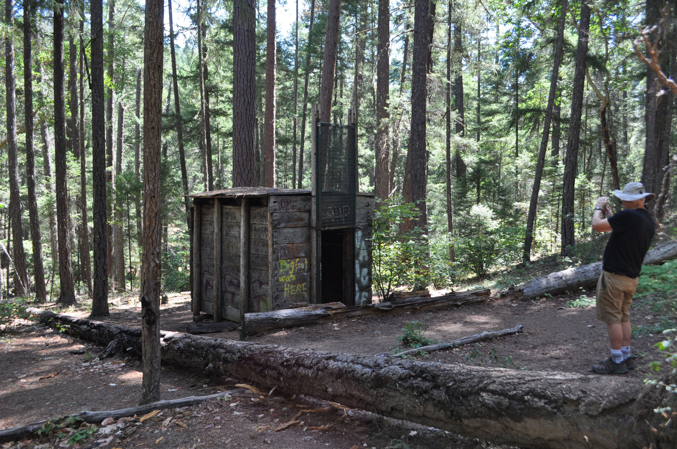 Curt takes a photo of the 10-foot square trap. I like the graffiti that says “Bigfoot was here.”