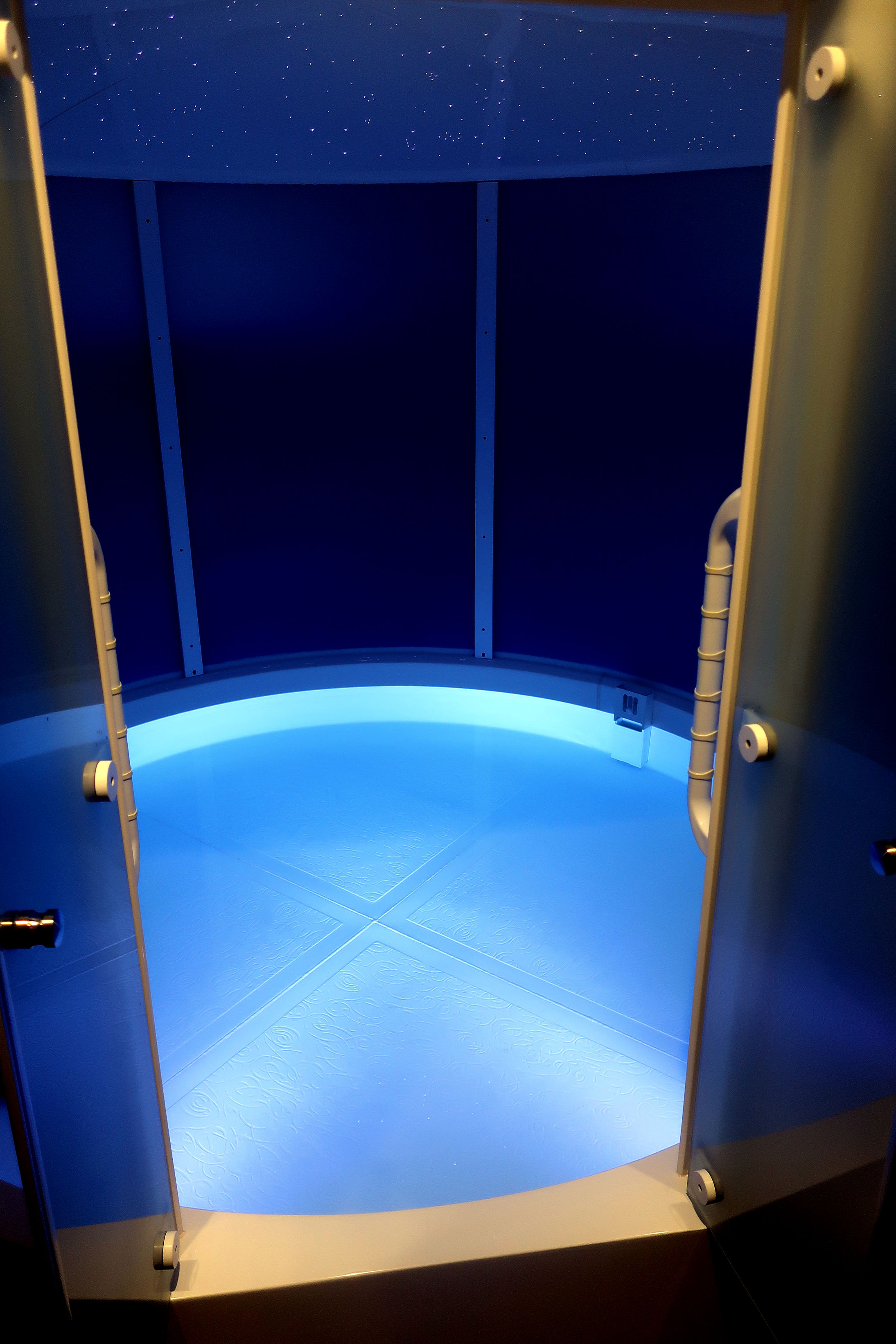 Looking through the open doors to a sensory deprivation tank at Enso Float in Portland.