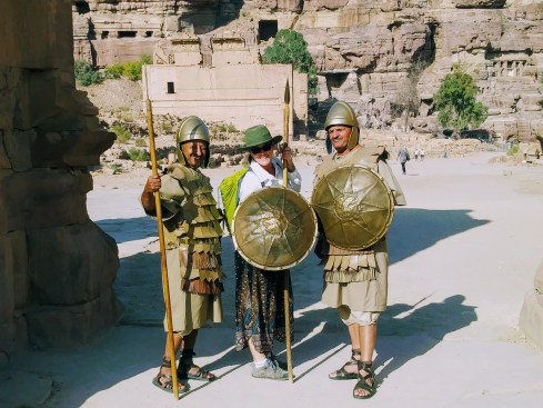 Since we got such an early start, we had coffee at the shop in front of the Treasury. We saw some splendid military uniforms that we found out later were the Bedouin branch of the Army. We saw the begging dogs and cats. We talked to many locals who were hoping to sell us something: a ride on a donkey, or a scarf, or a trinket. We bought Turkish coffee, loaded with cardamon. Most of all we gazed at the inspiring Al Khazneh in front of us.