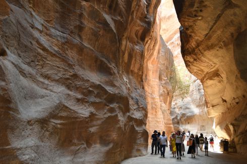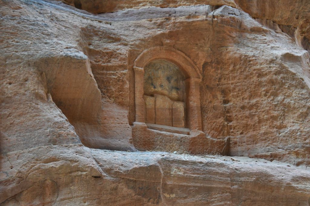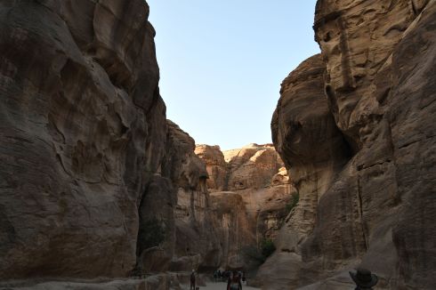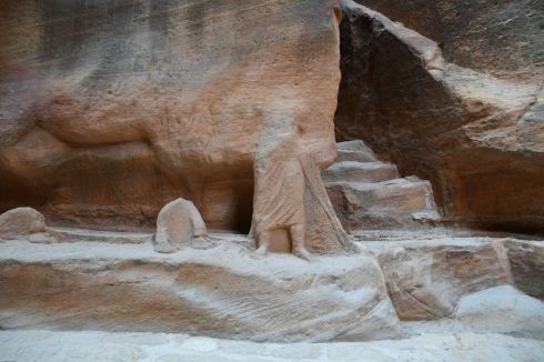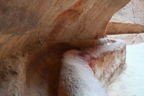 The path to Al Khazneh (The Treasury) in Petra, is through a deep canyon. The path is smooth and easy and flat, and the walls are steep. I spent a lot of time looking up into the sky, mouth open, gaping at the fabulous canyon, called the Siq. We had made the journey the night before, so we knew how long it would take, but in the dark we had not seen how beautiful it was. Even the walls that appear smooth hold carvings and monuments along the way.