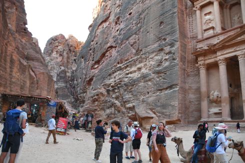 The entrance was the same path we followed the night before, and it was thrilling to see the red rock canyon in the light. It’s awe-inspiring. I walked with my neck craned up and head tilted all the way back, and yes, I did lose my balance and nearly tip over a couple of times! There were many people walking with us. It is the peak of tourist season, and many many languages surrounded us on all sides. The local entrepreneurs are ready to accommodate. Margaret was goofing around with one person who was trying to sell her something while speaking English, and she said “Nyet, spaciba!” The man immediately began speaking to her in Russian.