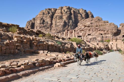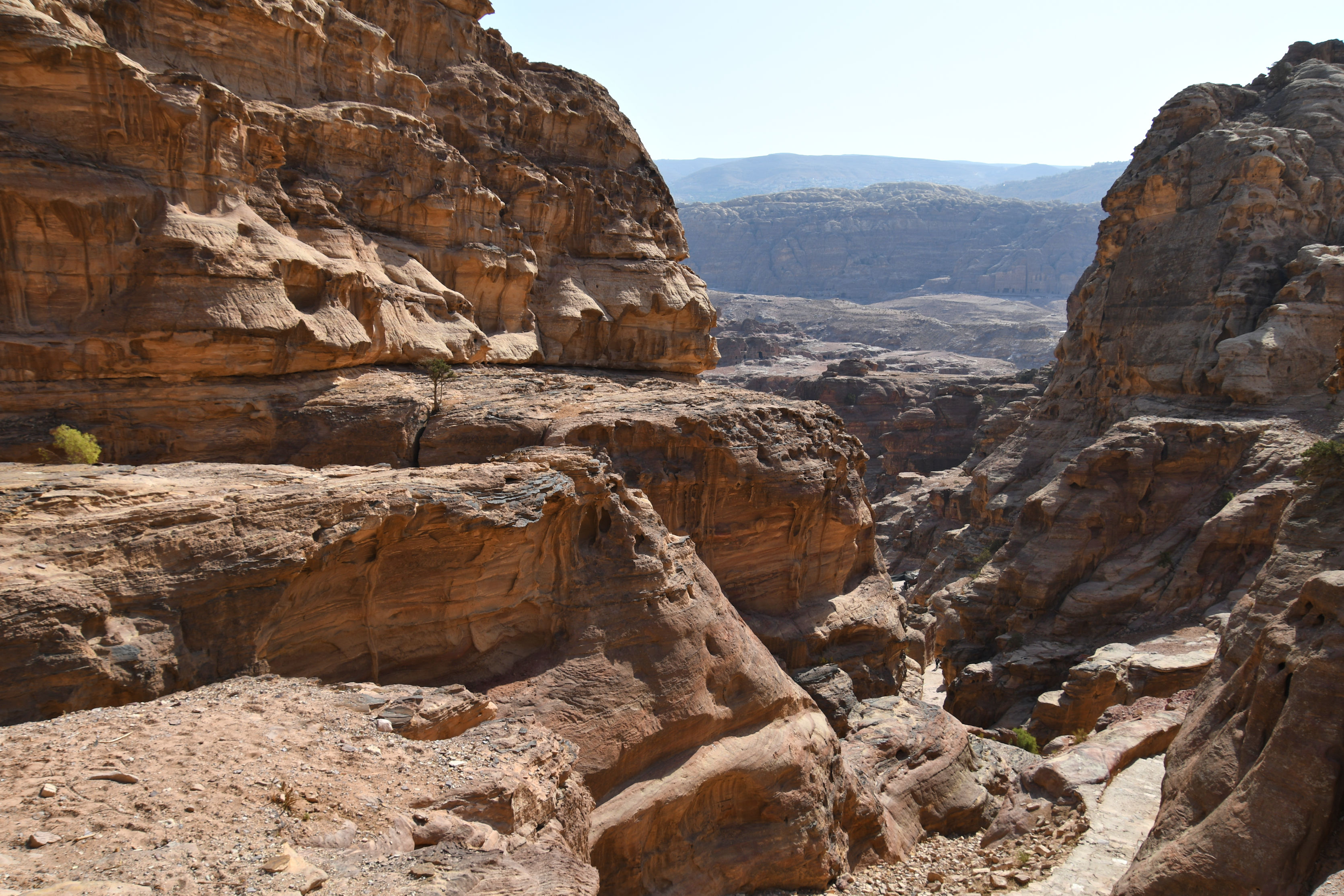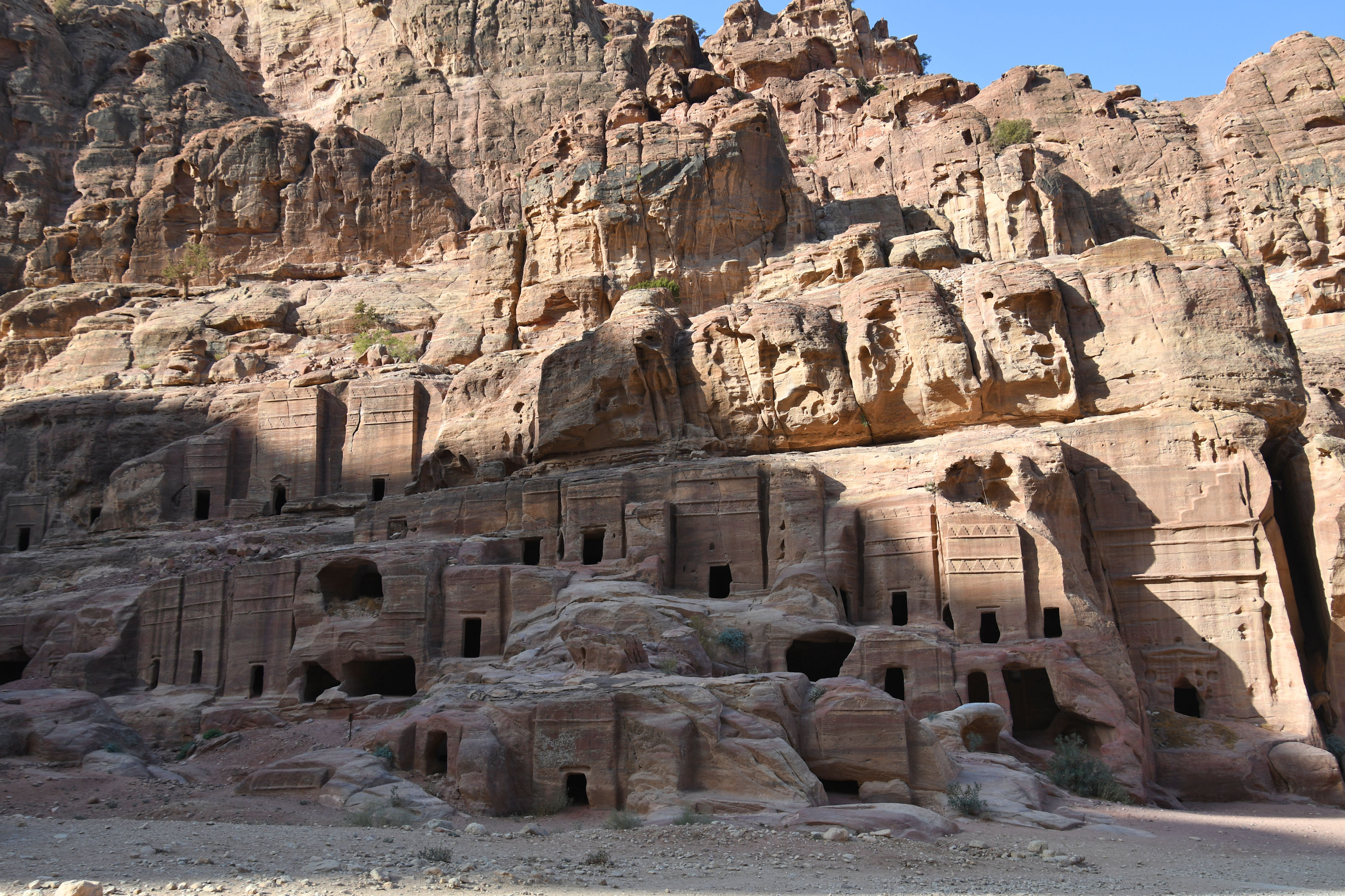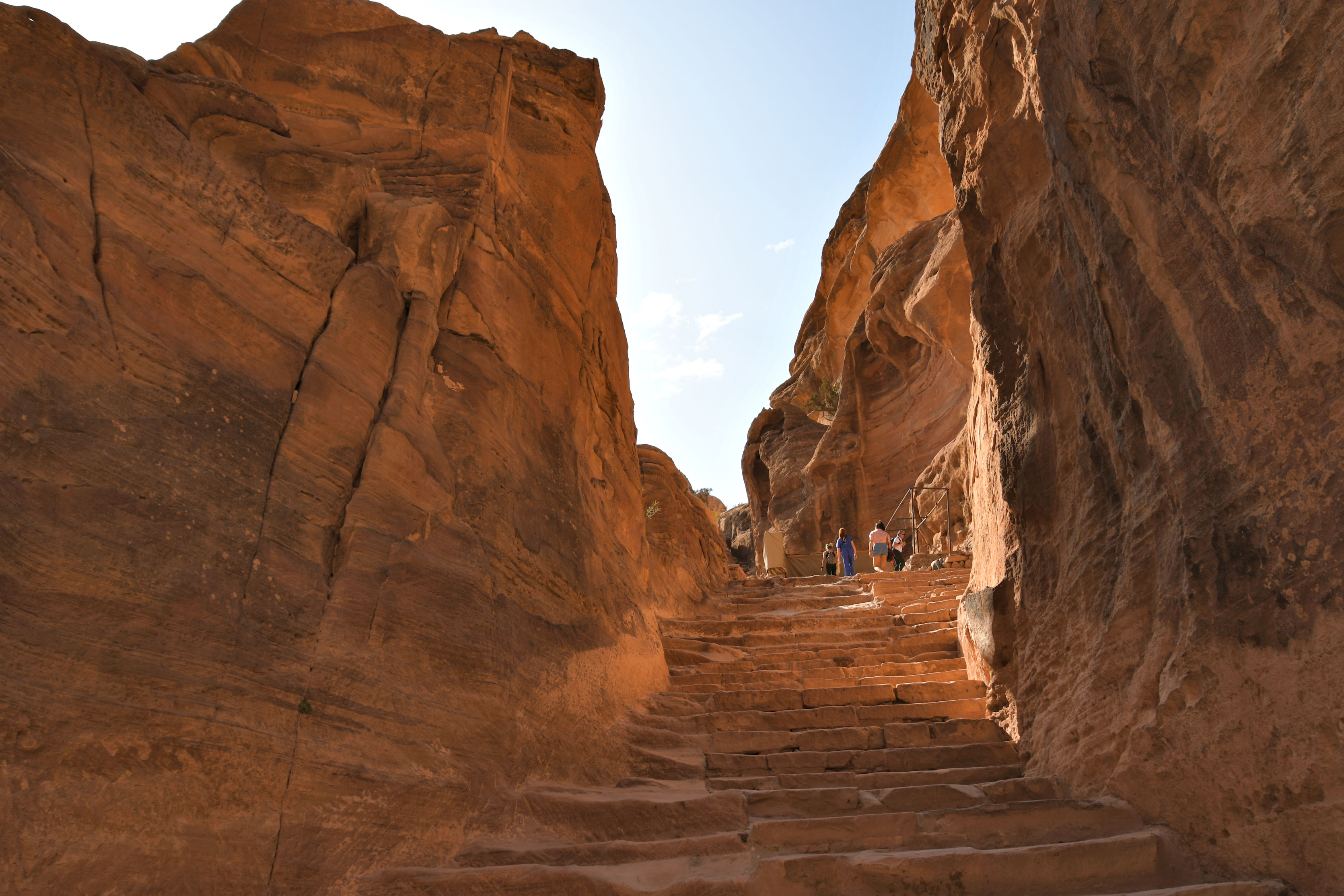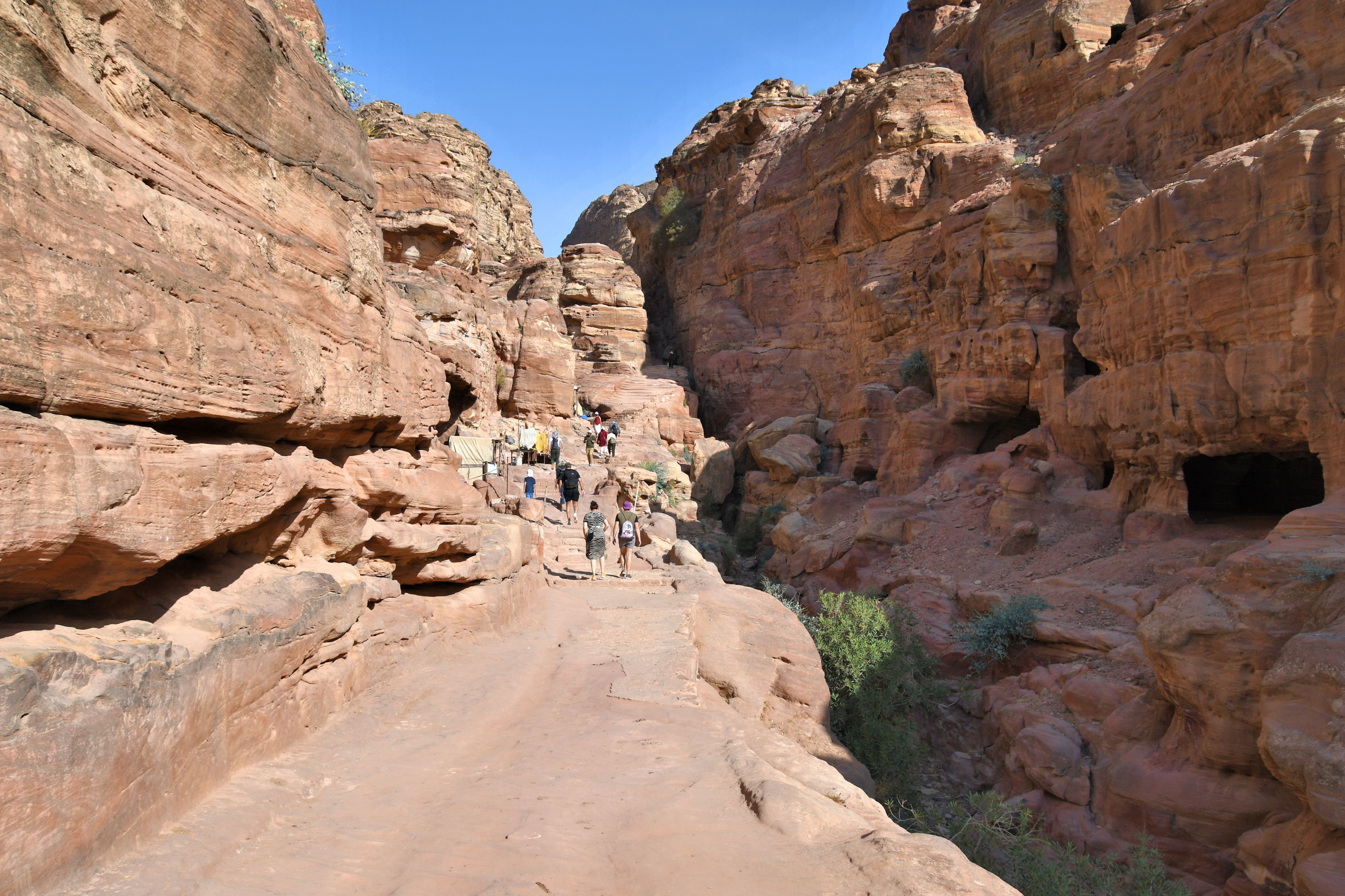 We began walking hard. We knew we had a lot of ground to cover and that would involve climbing stairs. We heard “1000 steps!” from the people trying to sell us a donkey ride, but I think it’s actually 890. In any case, that’s a lot of uphill. It was already hot, and we went fast to take advantage of the temperatures and shadows of morning. The scenes along the way are phenomenal as we headed for the next most famous facade: Ad Deir (commonly called The Monastery).
